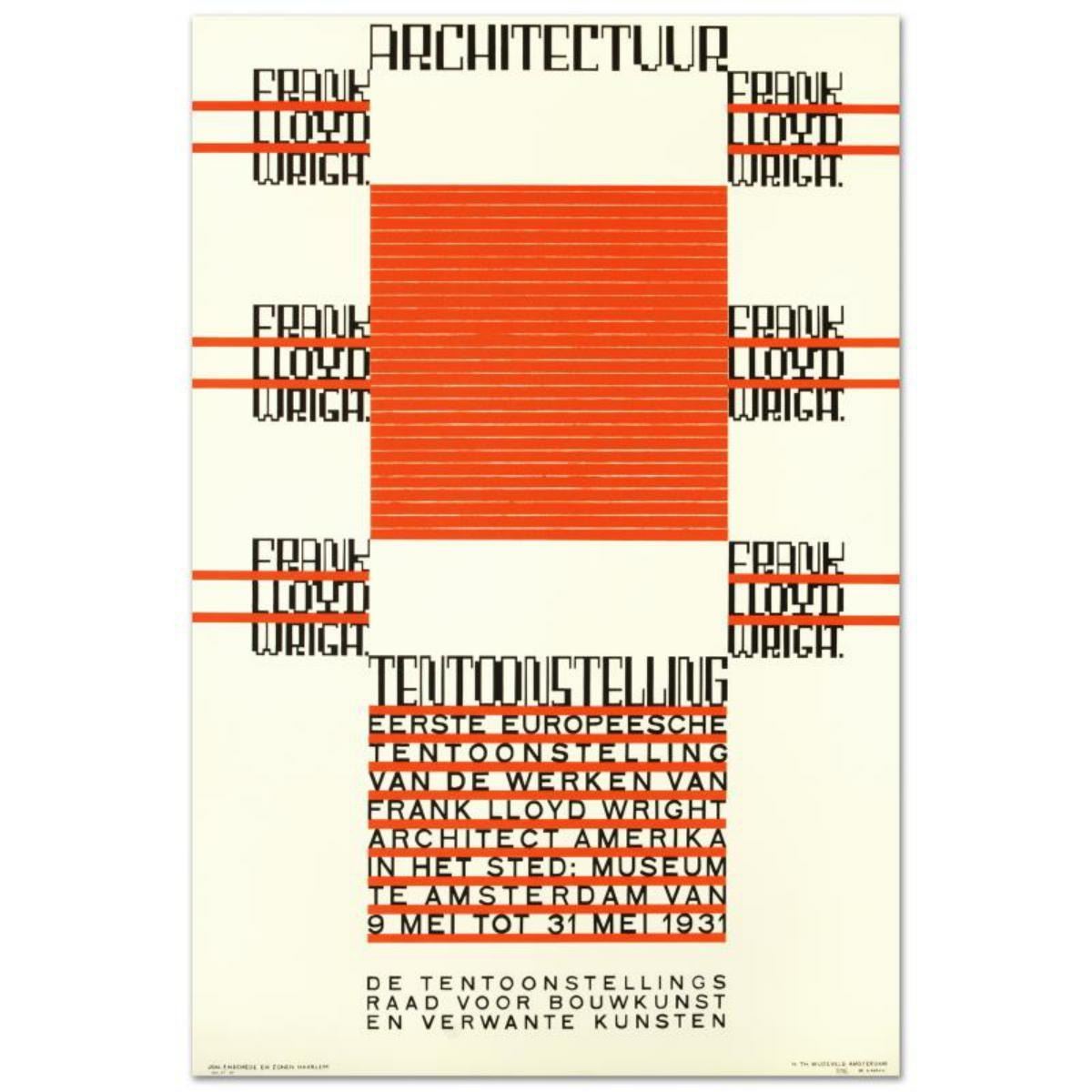 "Architectuur, F.L. Wright" is a hand pulled lithograph on paper by the RE Society, image originally by Hendrikus T. Wijdeveld. Includes letter of authenticity. Measures approx. 20" x 29.5" (image). Reference #: 202857.