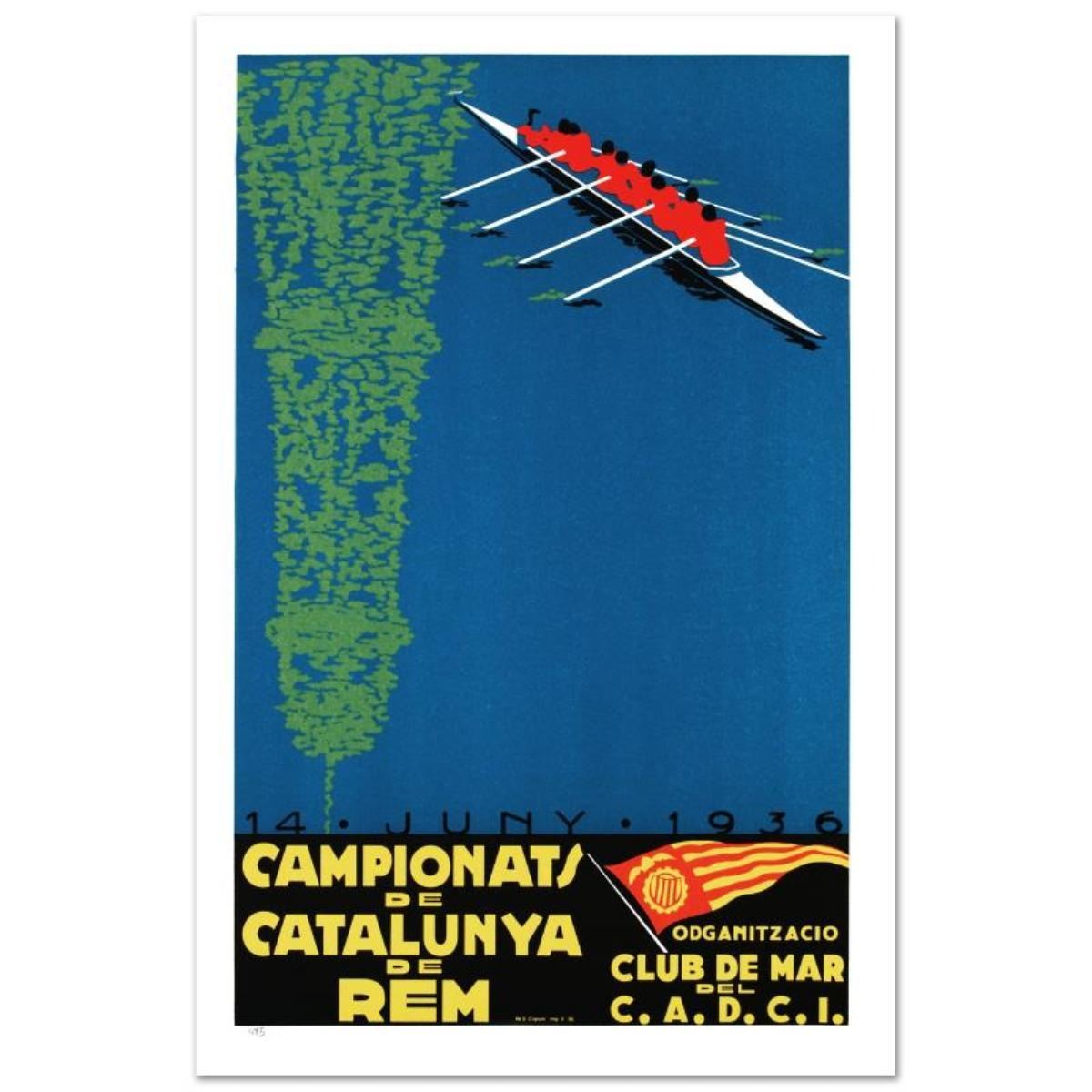"Campionats de Catalunya" is a hand pulled lithograph on paper by the RE Society, image originally by Camiro. Includes letter of authenticity. Measures approx. 15" x 22" (with border), 13" x 20" (image).