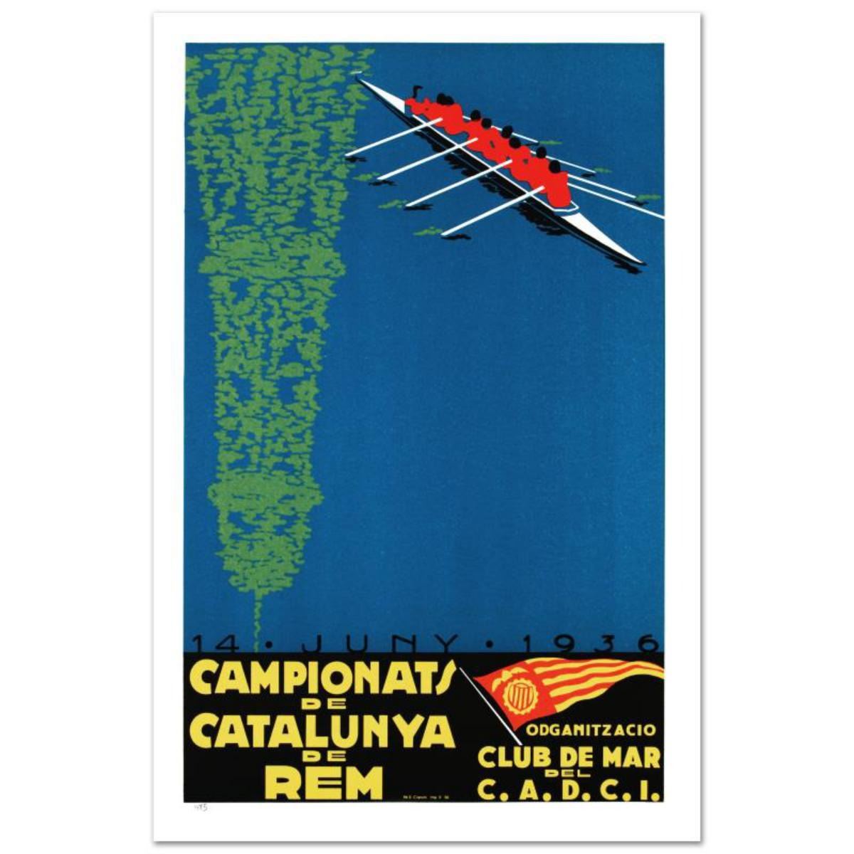 "Campionats de Catalunya" is a hand pulled lithograph on paper by the RE Society, image originally by Camiro. Includes letter of authenticity. Measures approx. 15" x 22" (with border), 13" x 20" (image). Reference #: 202766.