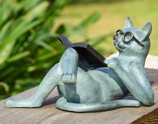 READING CAT GARDEN SCULPTURE - 10" x 18.5" x 11.5" - ALUMINUM