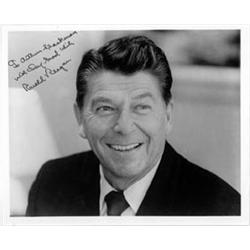 (b. 1911) Fortieth President of the United States who served for two terms (1981-1989) and contributed to the fall of European Communism. Handsome I.S.P. 10" x 8" b/w, a smiling head and shoulders shot, likely taken as President, boldly inscribed at top left in blue felt tip: "To Arthur Shackman with Every Good Wish Ronald Reagan." Fine condition.