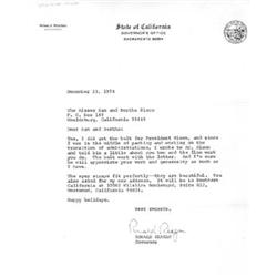 (b. 1911)  Fortieth President of the United States who served for two terms (1981-1989) and contributed to the fall of European Communism. T.L.S. as Governor of California, 1p. 4to., Sacramento, Dec. 23, 1974 to a couple informing them that he ""...did get the belt for President Nixon, and since I was in the middle of packing and working on the transition of administrations, I wrote to Mr. Nixon and told him a little about you to and the fine work you do. The belt went with the letter. And I'm sure he will appreciate your work and generosity as much as I have. The spur straps fit perfectly -- they re beautiful. You also asked for my new address. It will be in Southern California at 10960 Wilshire Boulevard, Suite 812, Westwood, California 90024..."" Usual folds, otherwise fine condition.