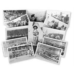 A great collection of ten real photo postcards most likely showing members of the Black Feet tribe at Fort Benton, with one card identifying the subjects as members of that tribe. The various views include tribal dances and meetings, and Indian elders. A great collection from Leos' studio with photo credit given to an "A. E. Forde" and two of the cards dated June 17, 1937. Along with another photo postcard entitled: "Going to the Sun Camp, Horses ready for trail, Glacier National Park", published by Hileman with slight paper lose in lower left corner; and a another postcard sized photograph of a man peering into an abyss identified as "Many Glacier" on verso. Two of the cards have slightly creased corners, else very good.