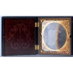 1/6 plate tintype covered by convex glass. Cover of case seems flawless but for minute loss at tip of upper right corner. Back is almost so, with two minor chips at edge near the upper right corner.