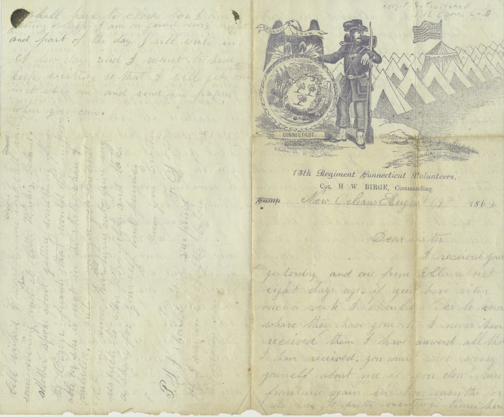 A fine war-date A.L.S. written by Pvt. Franklin S. Twichell, Co. B, 13th Conn. Vols., [POW Winchester, Va., Sept. 19, 1864. Died as POW Salisbury Prison, Dec. 9, 1864], 4pp. 8vo., on finely illustrated 13th Conn. stationery, New Orleans, Aug. 14, 1862. In part: "…we have got pretty exciting times here…the rebels attacked our troops at Baton Rouge on the 3rd…they got nicely whipped out. They had from 5 to 6 thousand men while we only had two thousand five hundred. Our loss was 60 killed and 150 wounded. The rebels lost about five hundred killed…we have not found out how many they had wounded as they carried most of them with them…it will be our turn next. They are making preparations to attack us immediately with 40 thousand men…we are ready for them…I am on guard at the St. James Hospital. Our regiment is scattered all over the city doing guard duty…". Very good.