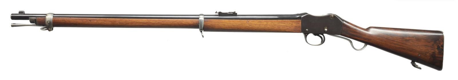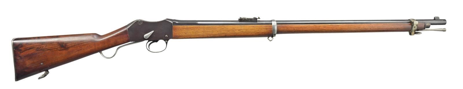 Cal. .450. NSN. Bbl. 32" rnd., w/ oct. breech section, fitted w/ ladder rear & steel blade front military sights. Martini action marked “ENFIELD”, “1874” & w/ crowned “V” over “II”. Buttstock of marbled European walnut has steel buttplate & sling loop. Forend extends to w/ in 2" of muzzle w/ steel cap & is retained by 2 iron bands held in place by pins, front w/ bayonet lug & sling loop. Trumpet shaped steel cleaning rod is present. CONDITION: fine as refurbished. Bbl. & action retaining over 95% reblue over scattered light pitting. Other metal parts polished bright, beginning to tone back. Stocks have renewed oil finish w/ some light subsequent marks. Bore appears to be bright & shiny, but is a bit dirty. (01-19376/MGM). ANTIQUE. $700-1,000.