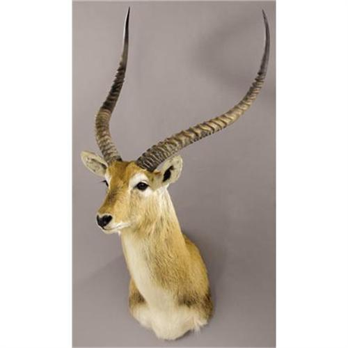 <B>RECORD-BOOK KAFUE FLATS LECHWE SHOULDER MOUNT</B></I><BR> <I>Kobus leche kafuensis</B></I><BR>This species has by far the most spectacular horns of any of the Lechwe family. They are highly gregarious animals and are often seen in herds of thousands, but are found only on the flood plains of Zambia and are now very expensive to hunt. This specimen is a high record-book bull that is currently #35 in the Safari Club International record books. The horns measure 32? x 32¾ inches long and 8 x 7? inches around the bases. From wall to nose-tip the mount measures 25½ inches, is 42 inches high and 23½ inches wide. <BR><BR><b>Shipping:</b> Requires 3rd Party Shipping (<a target="_blank" href="http://www.heritageauctions.com/common/shipping.php">view shipping information</a>)