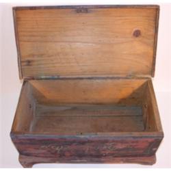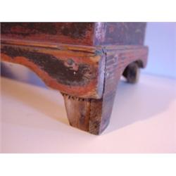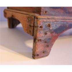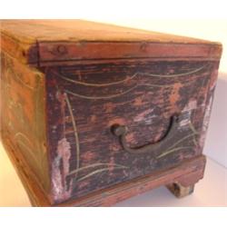 Red and black original painted miniature blanket chest. Missing several pieces of wood to feet on sides and front. Missing hinges. Original lock. Made of pine. Splendid red and black original paint. 7.75" H, 15" W, 7.5" D