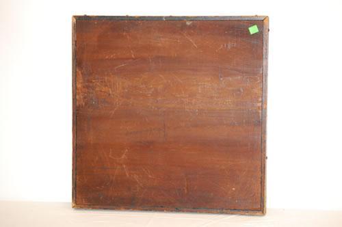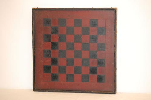 RED & BLACK PAINTED WOODEN CHECKERBOARD GAMEBOARD W/ TRAY EDGE RIM (EARLY 20TH CENT.; 19 1/8" X 19 1/4") - CRAQUELURE, WEAR TO PAINT, IMPERFECTIONS