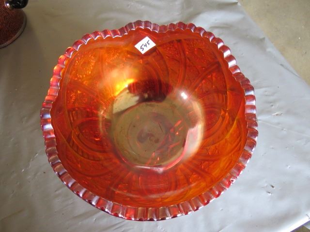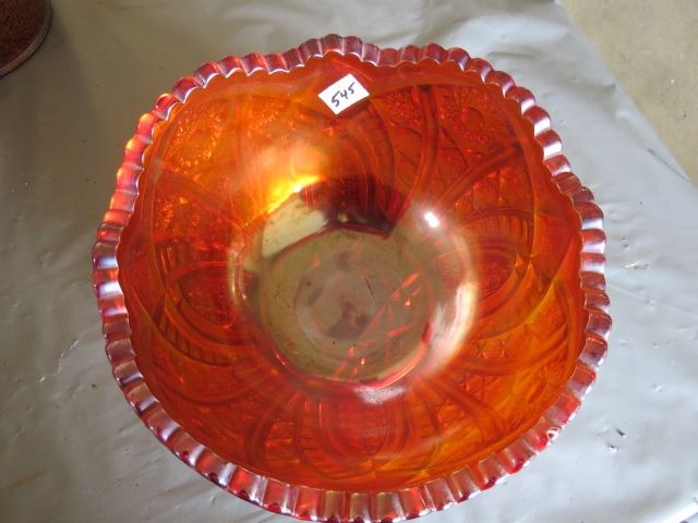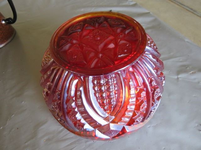 RED CARNIVAL GLASS HEAVY BOWL, PRESSED GLASS DESIGN, NO MARKS