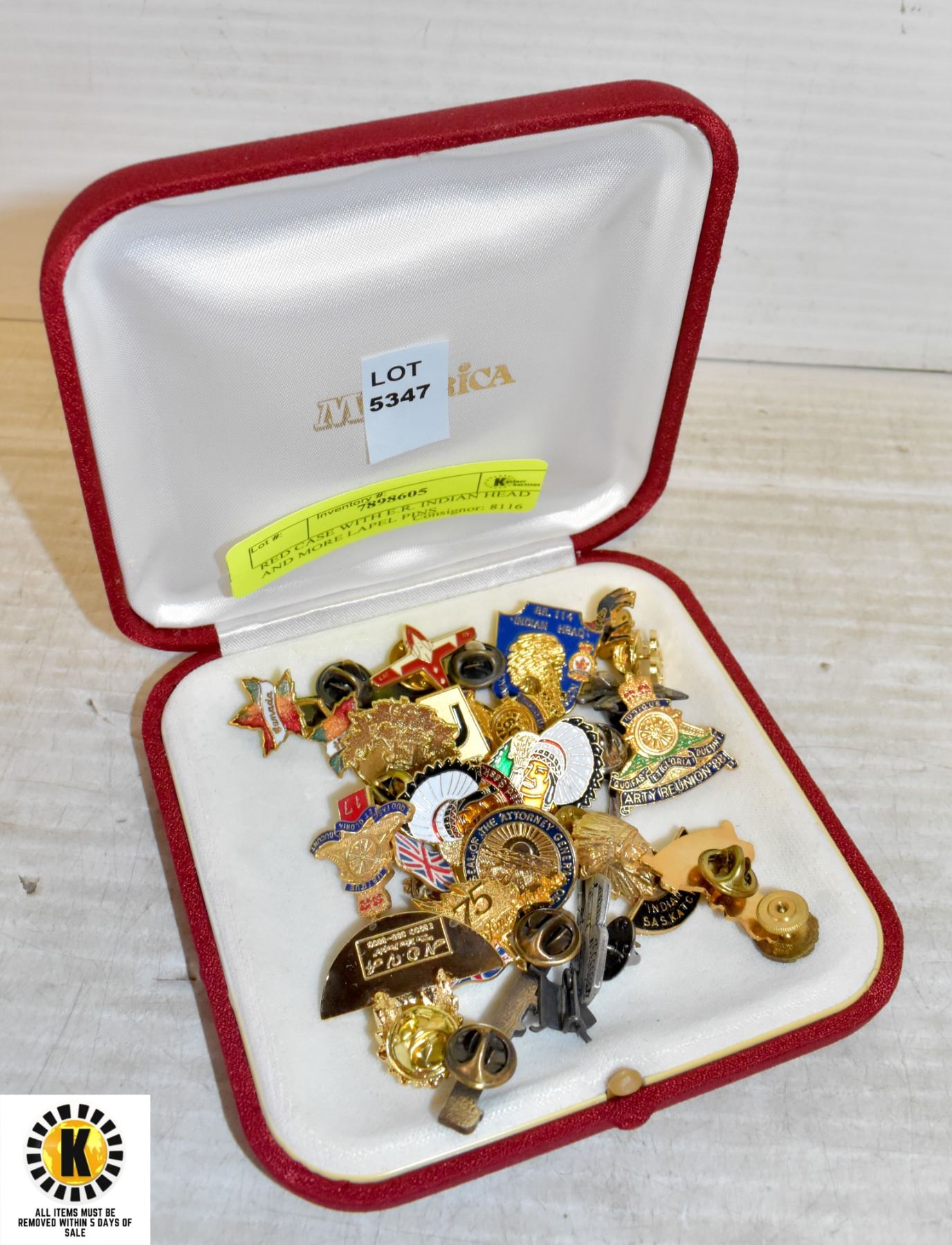 RED CASE WITH E.R. INDIAN HEAD AND MORE LAPEL PINS