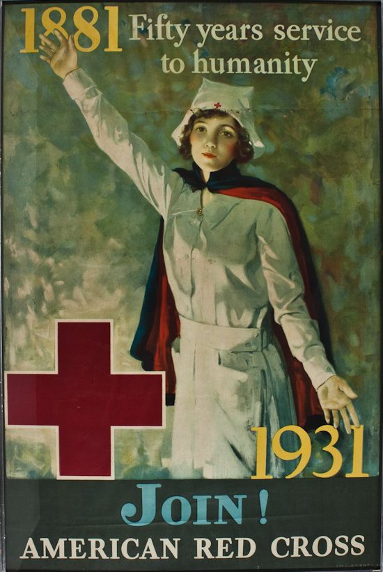 A Red Cross promotional poster by J. M. Clement, 20" x 30", shows a waving nurse in uniform and celebrating the fiftieth anniversary of the organization, asking the public to join. Some insect holes at horizontal fold just above nurse's head, light crease at bottom, else very good.