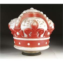 RED CROWN GASOLINE GLOBE. One-piece milk glass gasoline pump globe in the figural shape of a crown. SIZE: 16” diam. x 16 1/2” t. CONDITION: Good unrestored condition with paint loss to upper portions of globe. Could use a good cleaning. PF 1-3648 (200-300)