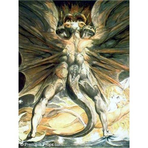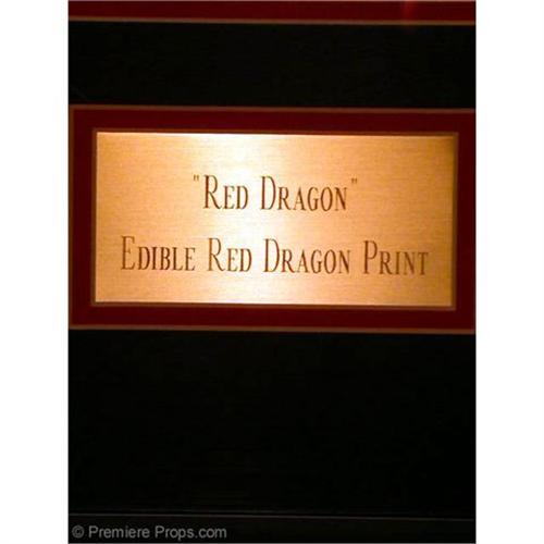 RED DRAGON: This movie prop is from the film "Red Dragon." The Red Dragon print is made of sugar paper so it could be eaten by Dolarhyde. The print has been sprayed for protection. The black wood frame measures 25.25" x 32.75" x .75" and features a red matte. This prop is professionally framed under special UVA protective plexi-glass with high end matting materials to preserve this delicate piece. Also included is an engraved brass description plate! This was one of several edible prints made by the studio just for the movie and is ready for display! A must have for the true fan!