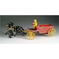 RED “DUMP WAGON.” Manufactured by Hubley Mfg. Co. A brightly red enameled cart with gold highlighted “DUMP WAGON” embossed on either side. When the lever is pulled, the bottom of the cart drops to release the load being carried. The cart is being lead by two prancing horses painted black with gilt highlighting and carried on yellow spoke wheels. The driver is a man wearing a yellow enameled suit and hat with flesh-toned face and hands. SIZE: 14”. CONDITION: Overall condition is very excellent with some minor chipping. MC 1-3816 (500-700)