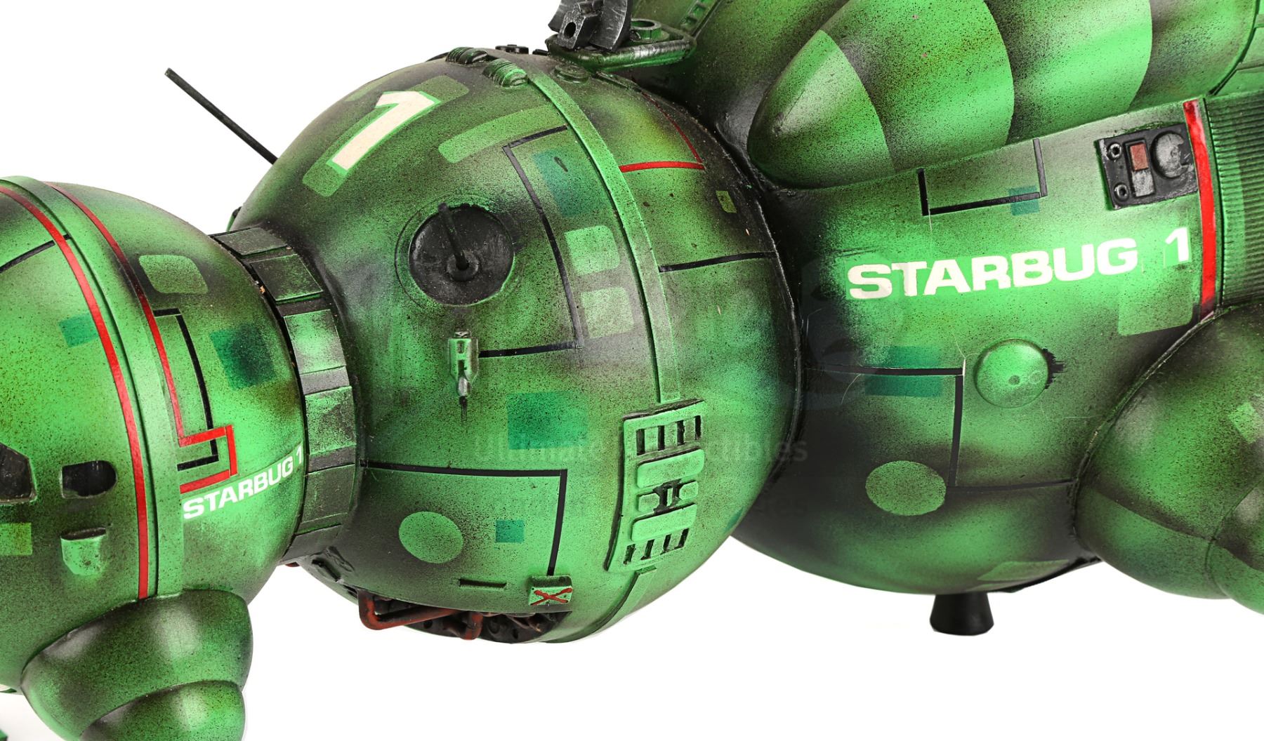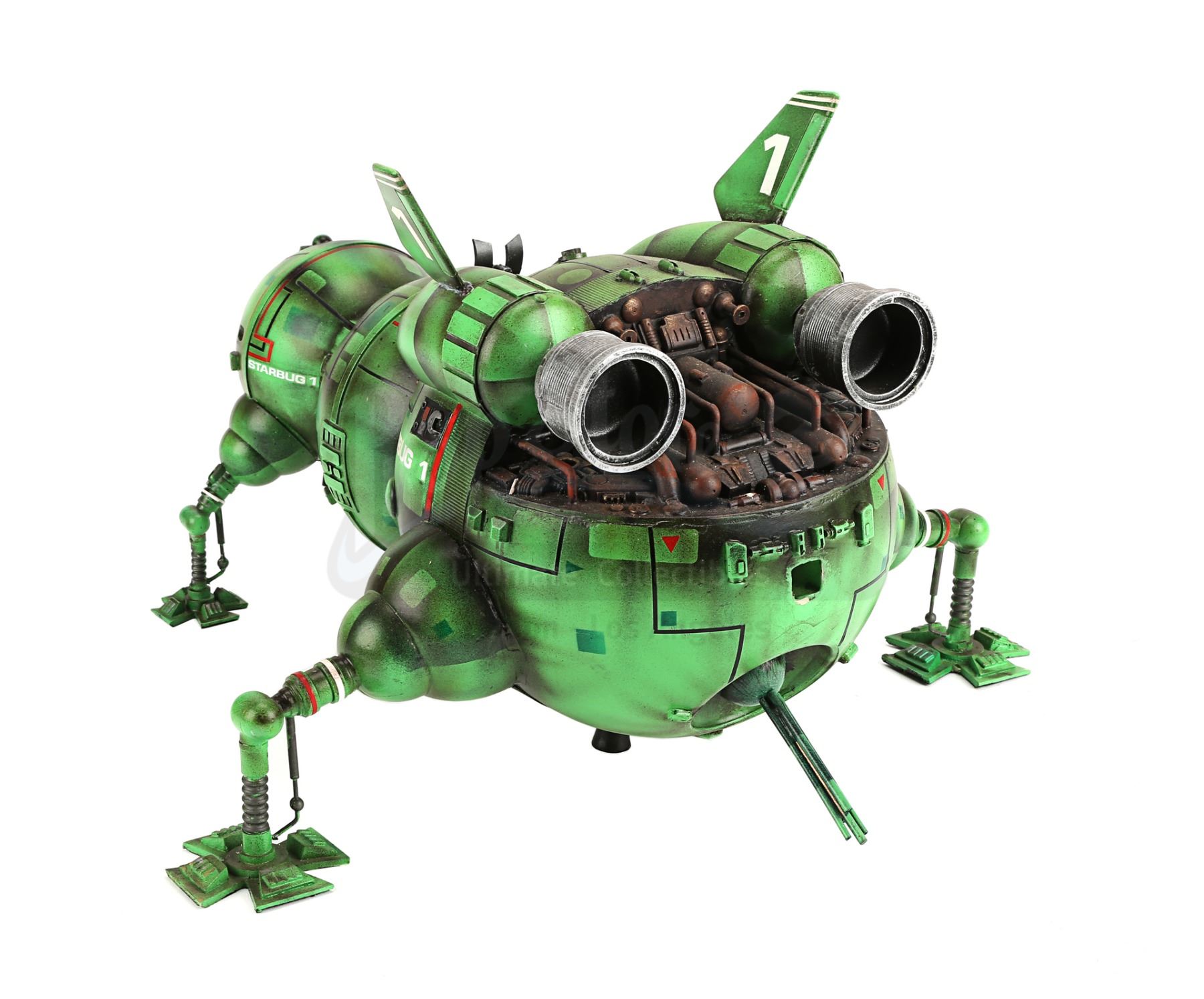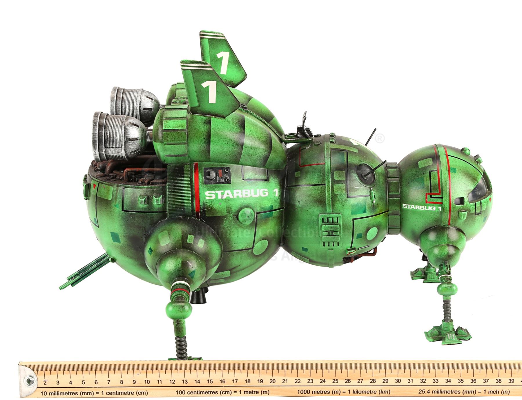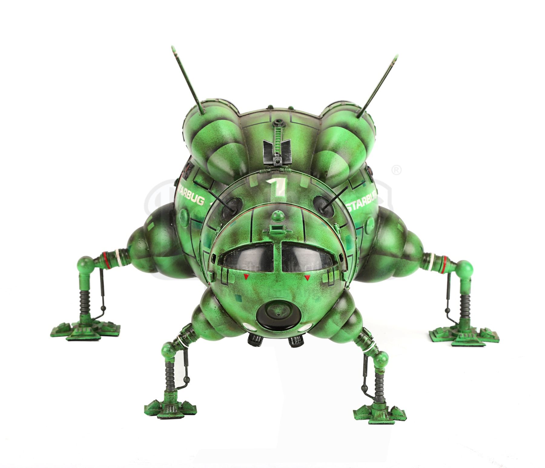 A model miniature of Starbug 1 from the sci-fi comedy television show Red Dwarf. The notoriously unreliable Starbug shuttles first appeared in Series III and were the crew's primary mode of transportation to different planets, although they were often crashed by the crew.