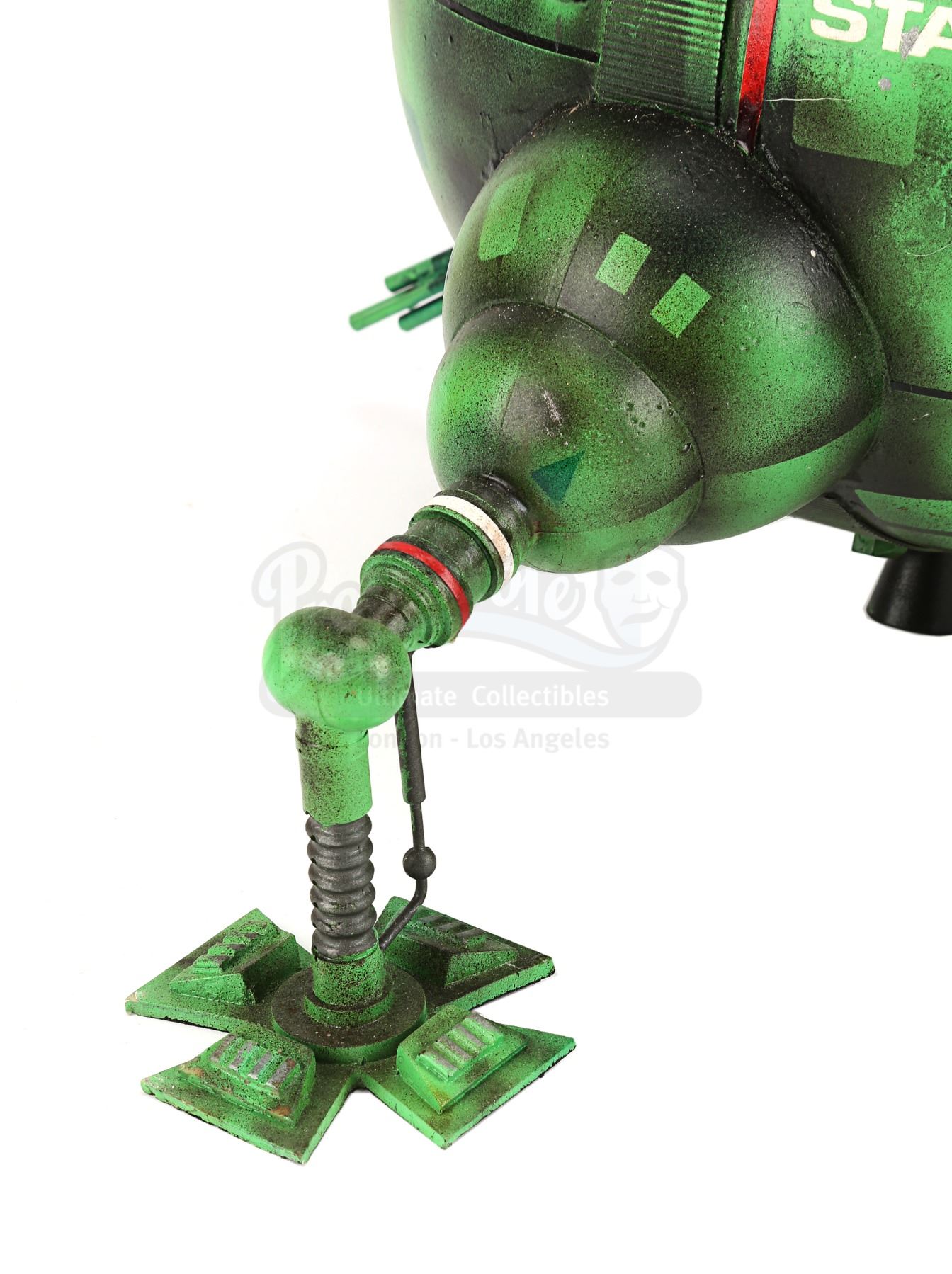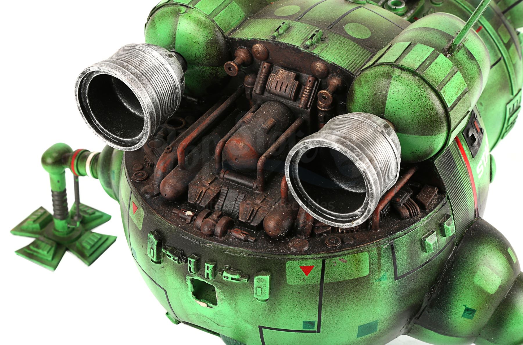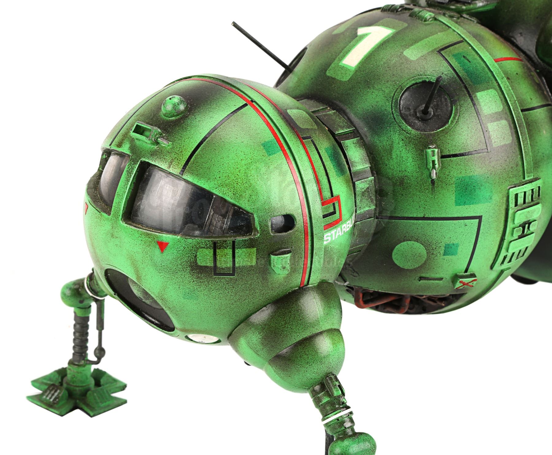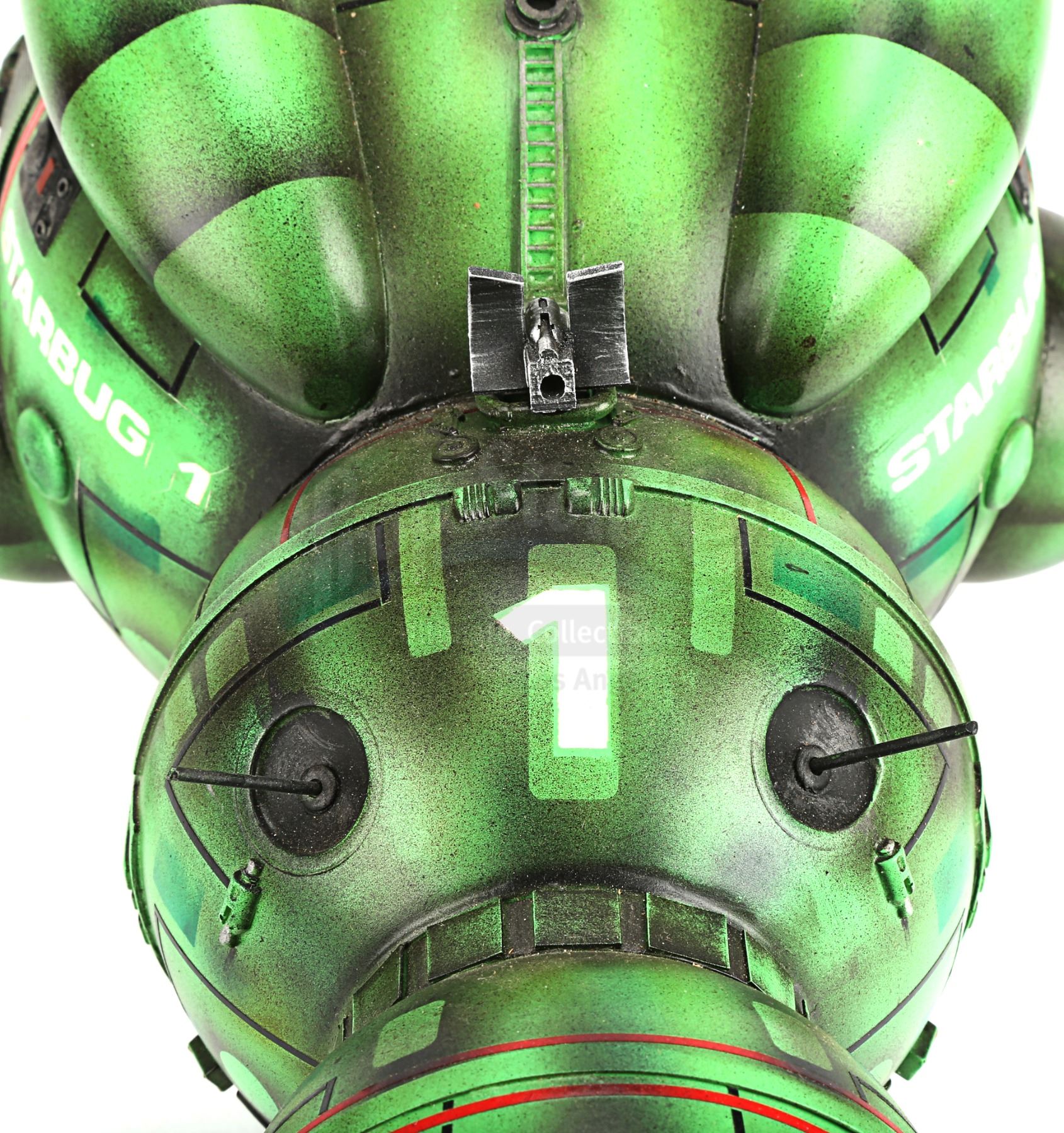 The craft resembles an insect, with three bulbous sections, rocket thrusters on the rear, and four landing legs. Decals reading "Starbug 1" are applied to the front and rear sections on each side of the ship, and "1" transfers are applied to the top of the ship's central compartment and on its fins. A clear canopy covers the cockpit. The rear of the body has a square hole where a rod was placed, supporting the model during filming.The model has very minor wear from production use and age, including some scuffing, scratches and a couple of small areas of paint wear. Dimensions: 40 cm x 40 cm x 26 cm (15 3/4" x 15 3/4" x 10 1/4")