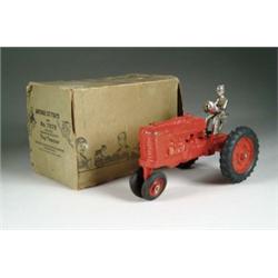 RED FARMALL TRACTOR IN OB BY ARCADE. Tractor painted red overall with black rubber tires w/red painted hubs, cast iron nickel-plated driver and steering wheel, two MCCORMICK-DEERING FARMALL” decals and an original Arcade decal. With original box marked “NO. 7070 MCCORMICK-DEERING FARMALL TOY TRACTOR”. A great looking tractor! SIZE: 7” l. CONDITION: Excellent with minor wear to top of tractor. Box in good condition. MC 1-3945 (700-900)