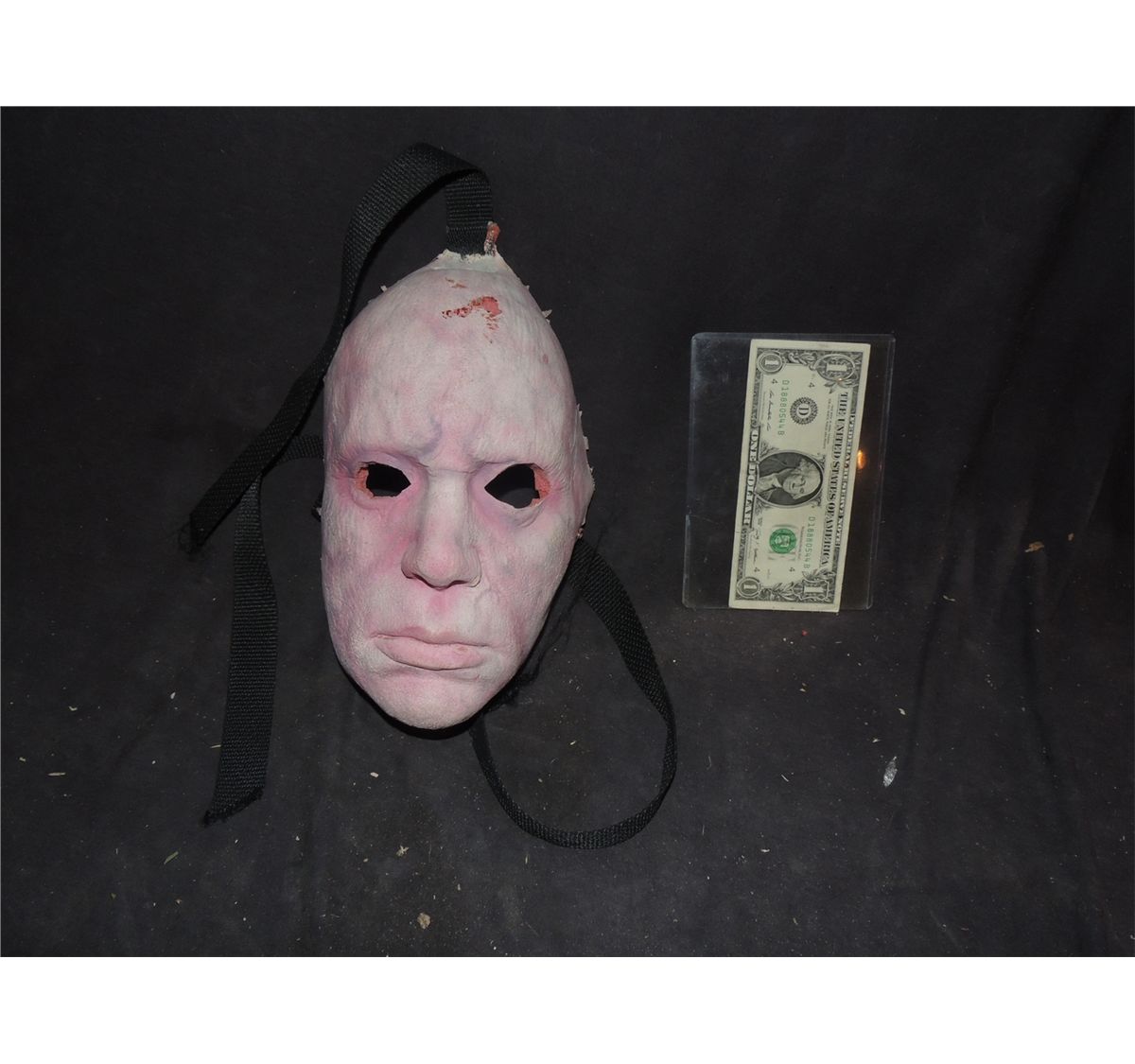 This is a full face red ghoul Zombie mask with straps.