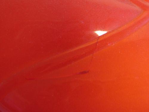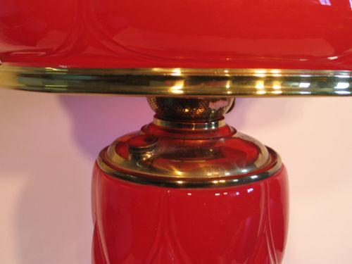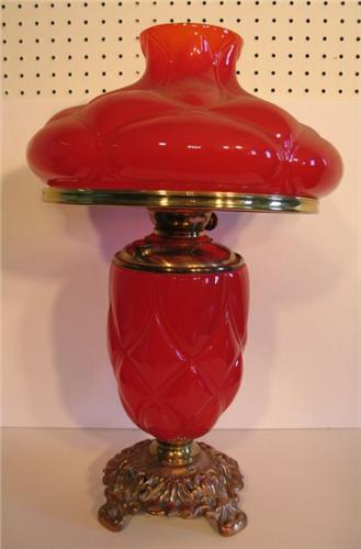 RED GLASS TABLE LAMP. Shade and base are red glass puffy patterned. Brass base at bottom. Electrified. Shade has one hairline crack. 22” H