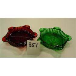 Set of 2 glass ash trays. One red, one green. Depression-type, but maker & pattern unknown. Rayed patterns in base. 4" wide.