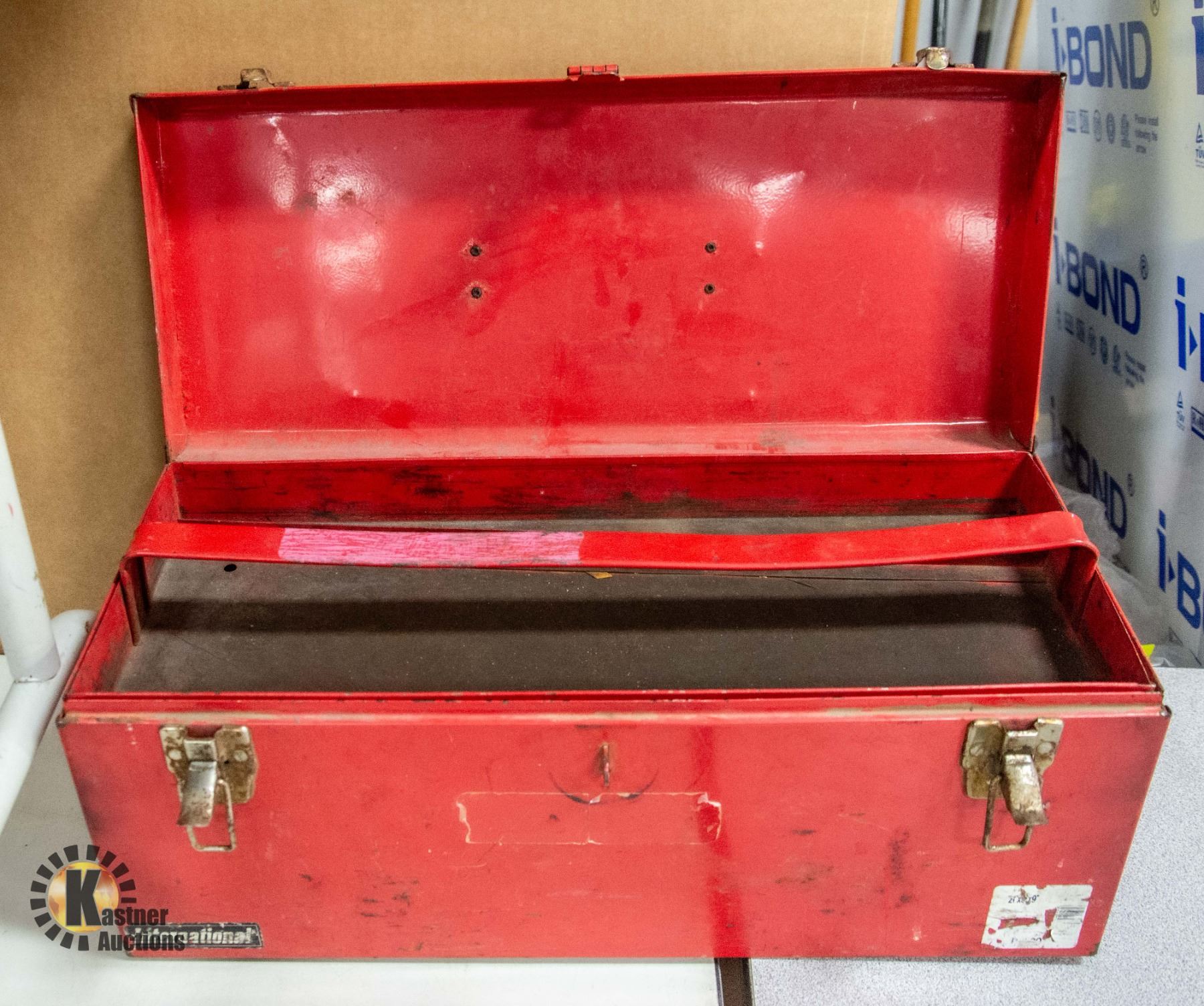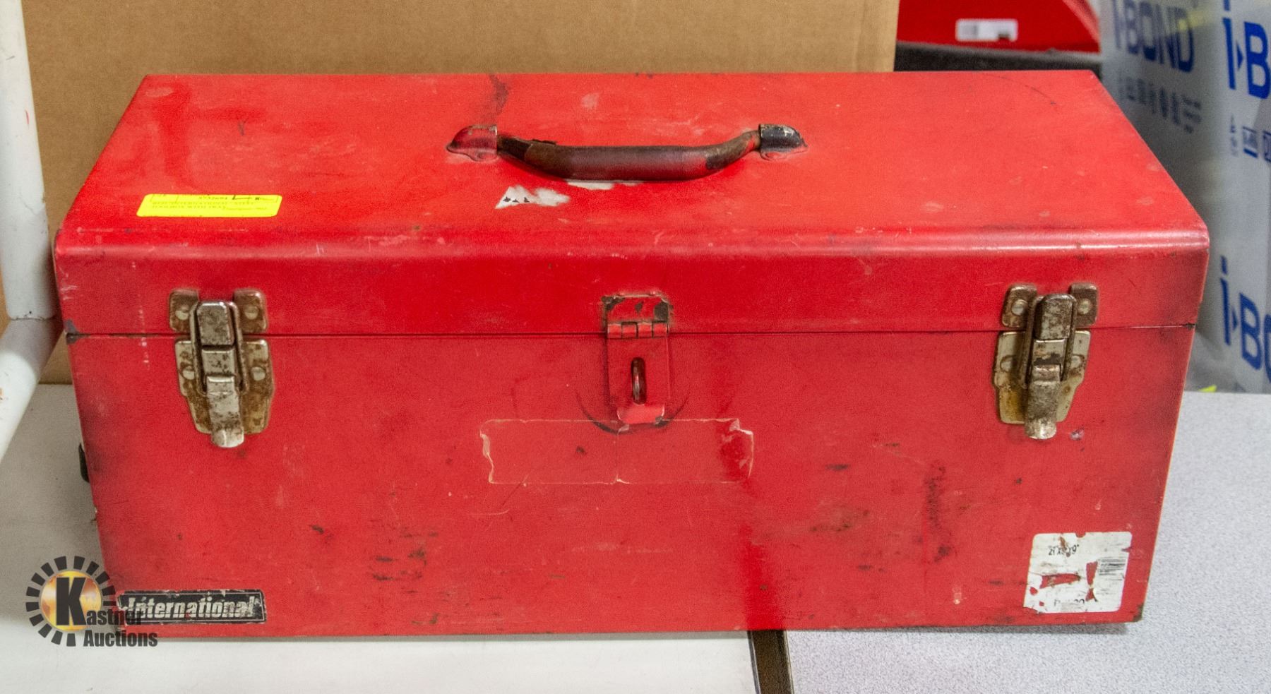 RED "INTERNATIONAL" STEEL TOOLBOX WITH TRAY,