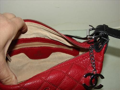 RED LEATHER PURSE WITH BLACK STRAP AND ACCENTS SIGNED CHANEL. AS SHOWN. VIEW PICTURE FOR DETAIL.