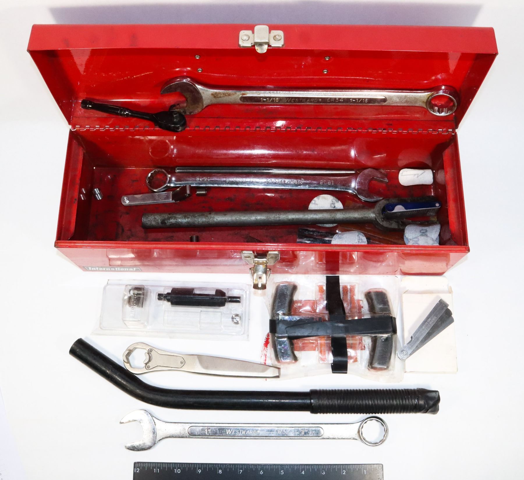 TOOLS INCLUDING SPARK PLUG GAPPER, WESTWARD AND GEARWRENCH WRENCHES, RATCHET, CHEATER BAR, AND MORE