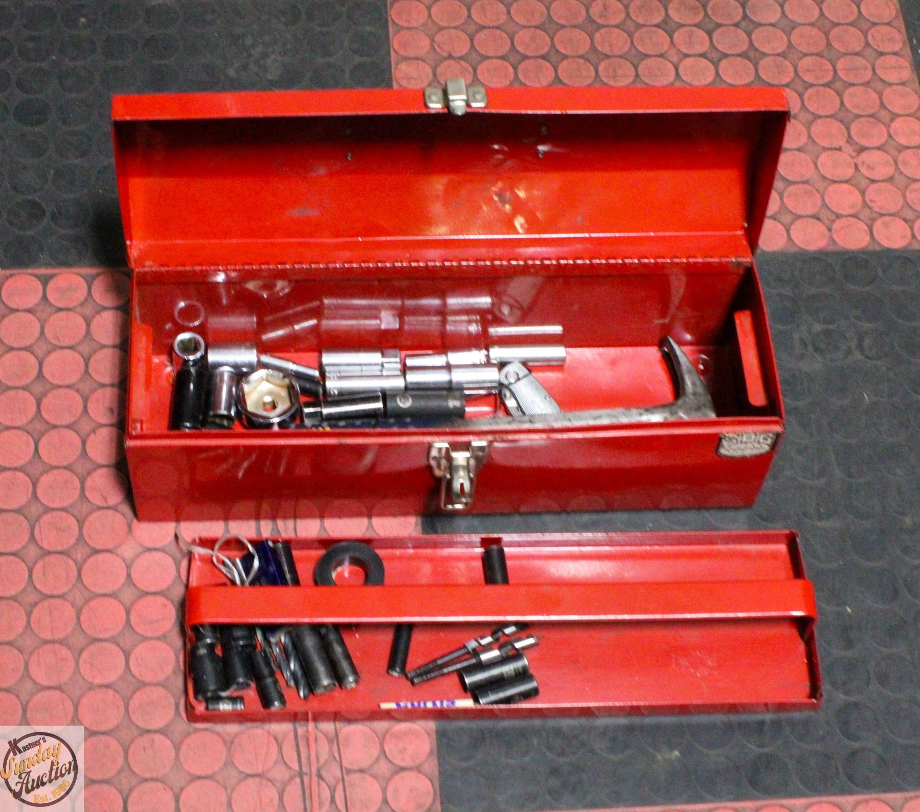 RED METAL TOOL BOX WITH VARIOUS SOCKETS
