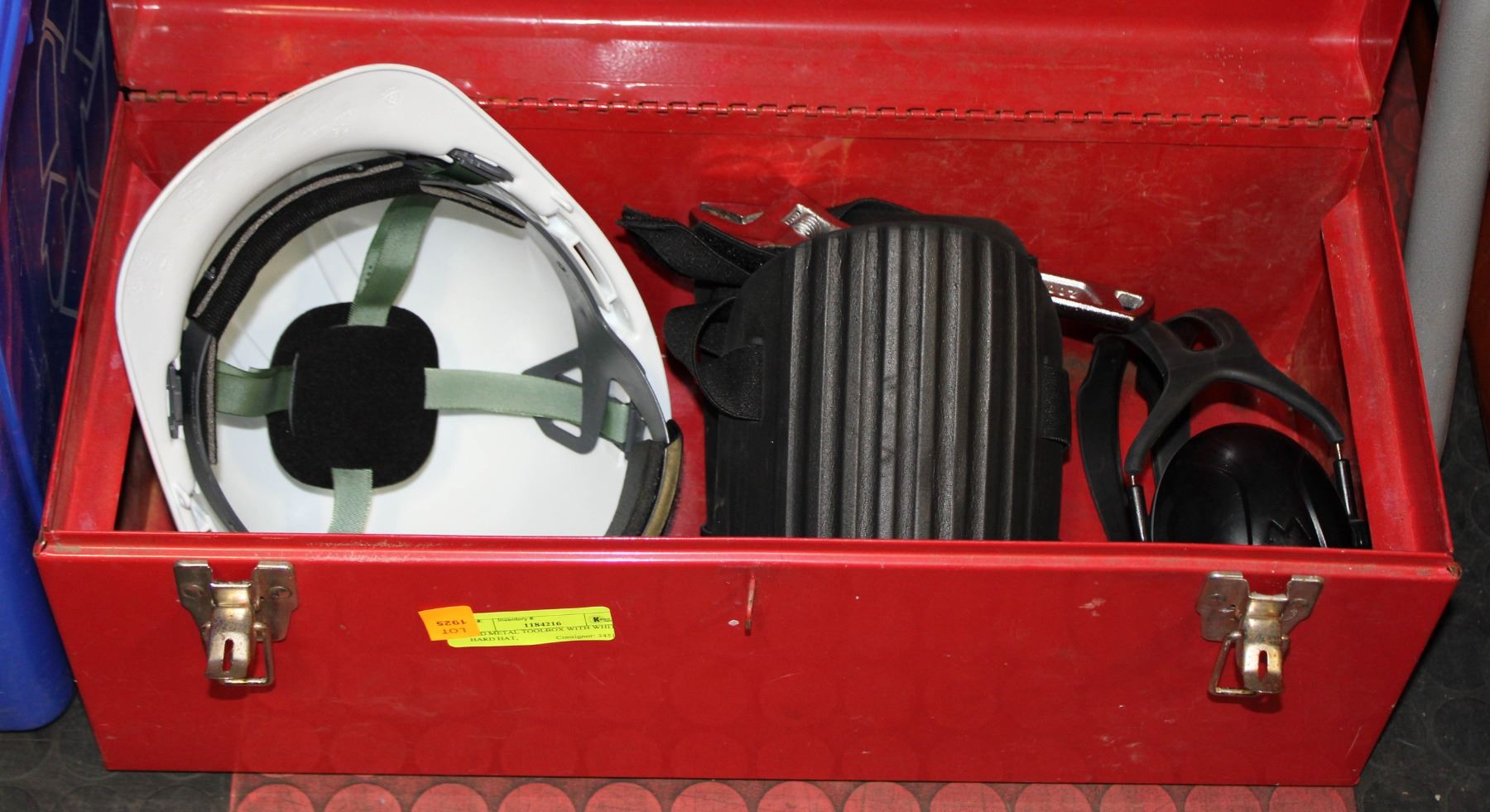 RED METAL TOOLBOX WITH WHITE HARD HAT,