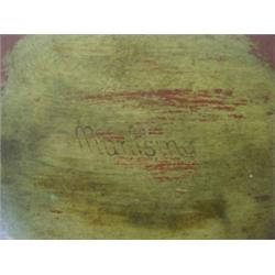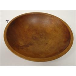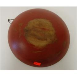 Red overpainted primitive wooden ware bowl. Signed on bottom Munising. 10" Dia.