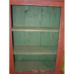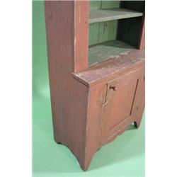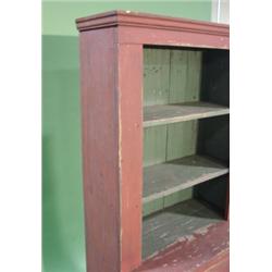 RED PAINTED STEP-BACK CUPBOARD. Red painted outside with green painted inside and shelves. 65.5" H, 29.25" W, 16.25" D