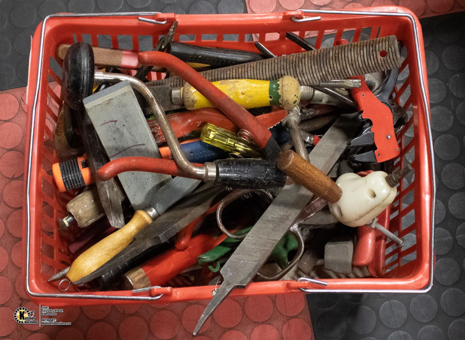 RED PLASTIC CONTAINER WITH HANDTOOLS
