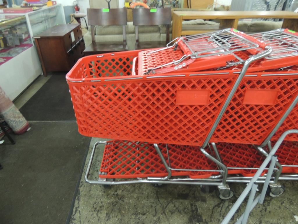 NEW SHOPPING CHAIR, LARGE SHOPPING CART, RED PLASTIC & METAL SHOPPING CART, STORE SHOPPING CART AS SHOWN SEE PHOTO FOR MORE DETAILS.