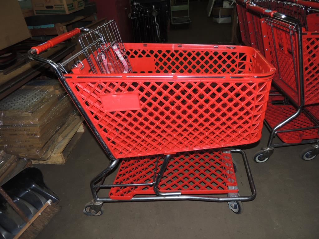 NEW SHOPPING CHAIR, LARGE SHOPPING CART, RED PLASTIC & METAL SHOPPING CART, STORE SHOPPING CART AS SHOWN SEE PHOTO FOR MORE DETAILS.