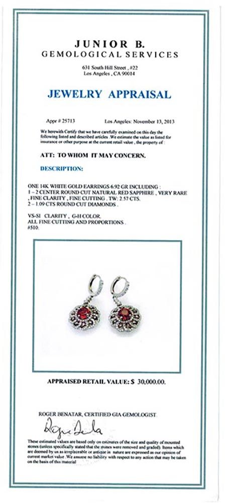 RED SAPPHIRE RD 2.57CT, 14K W/G EARRING 6.92GRAM / DIAMOND 1.09CT