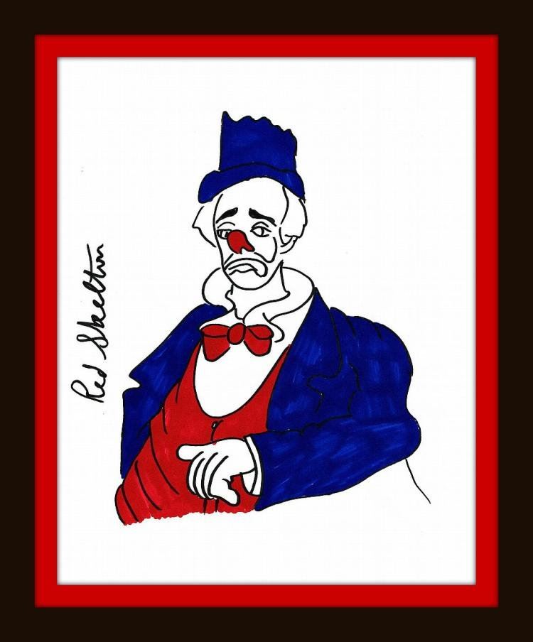 Red Skelton believed his life's work was to make people laugh and wanted to be known as a clown, because he defined it as being able to do everything. He had a 70-year career as a performer and entertained three generations of Americans during this time A Red Skelton drawing signed by Red at the bottom. Size: 15.5 x 11 inches. Professionally framed and mounted in hardwood.