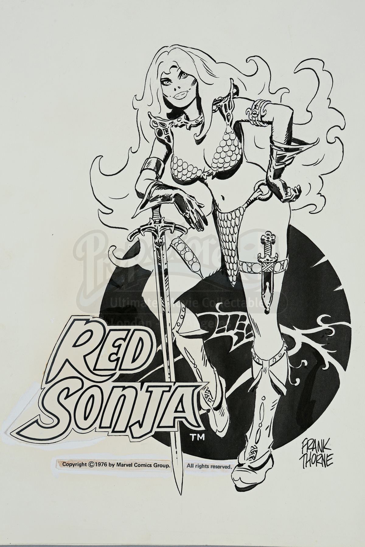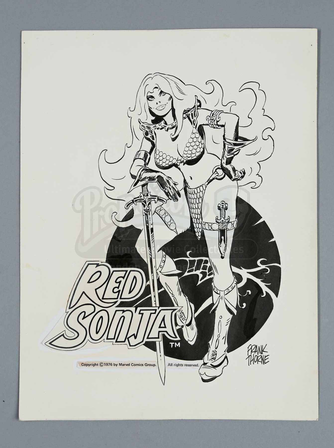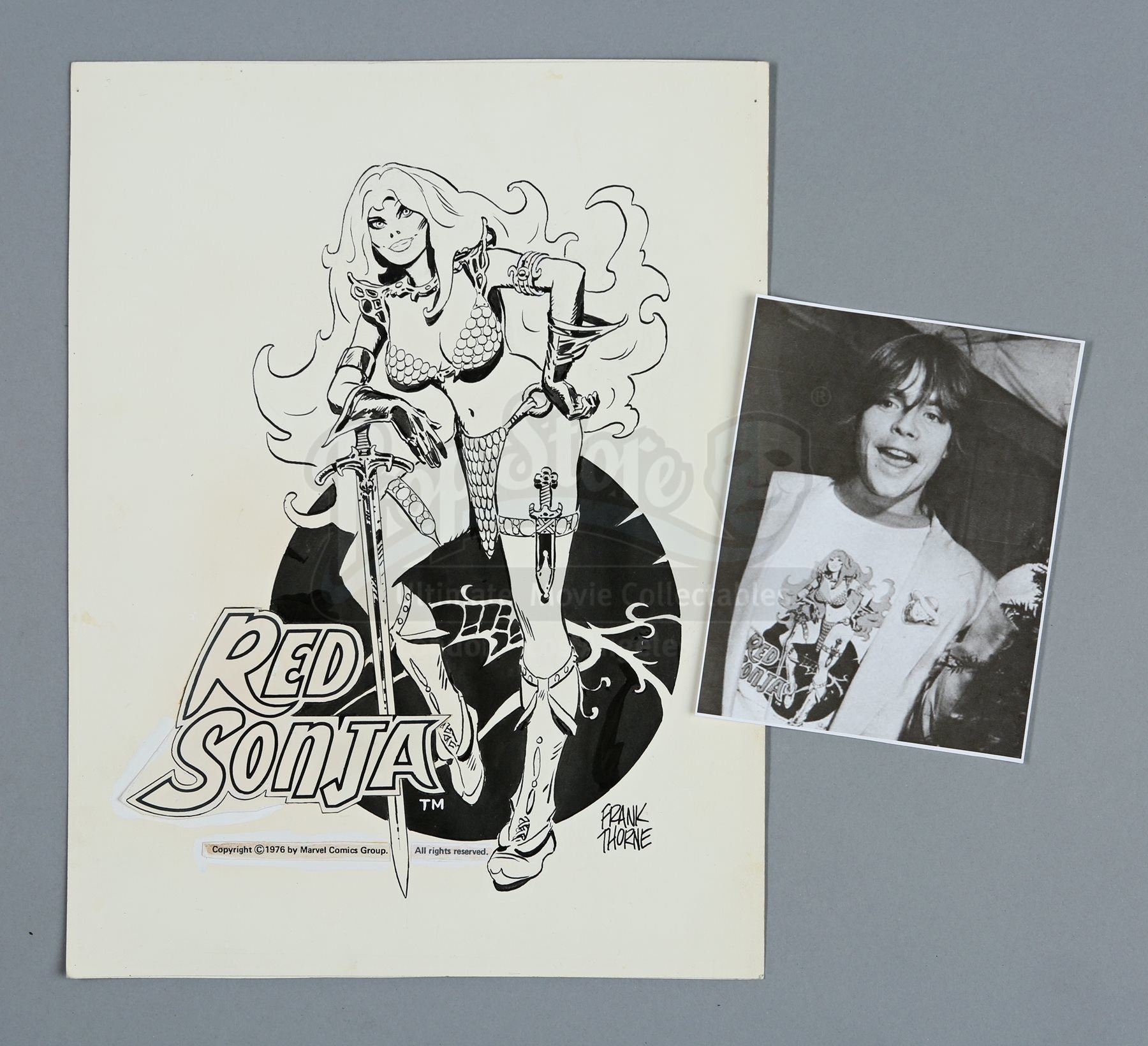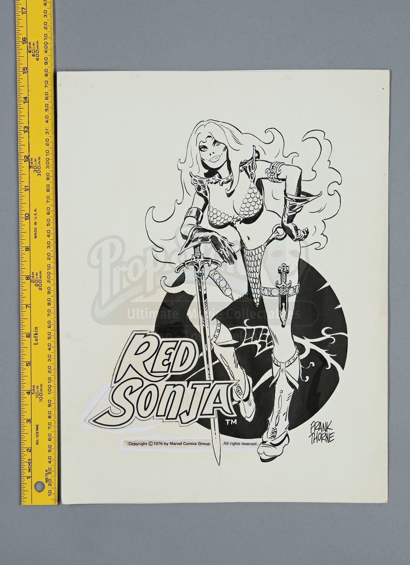 Hand-drawn Red Sonja 1976 T-shirt artwork by Frank Thorne, and an autographed Legends of Red Sonja comic book. This original inked artwork is rendered on Bristol board by Frank Thorne. It was originally released as a T-shirt design in 1976 and was later published as the cover artwork for Legends of Red Sonja #4 in 2014.
