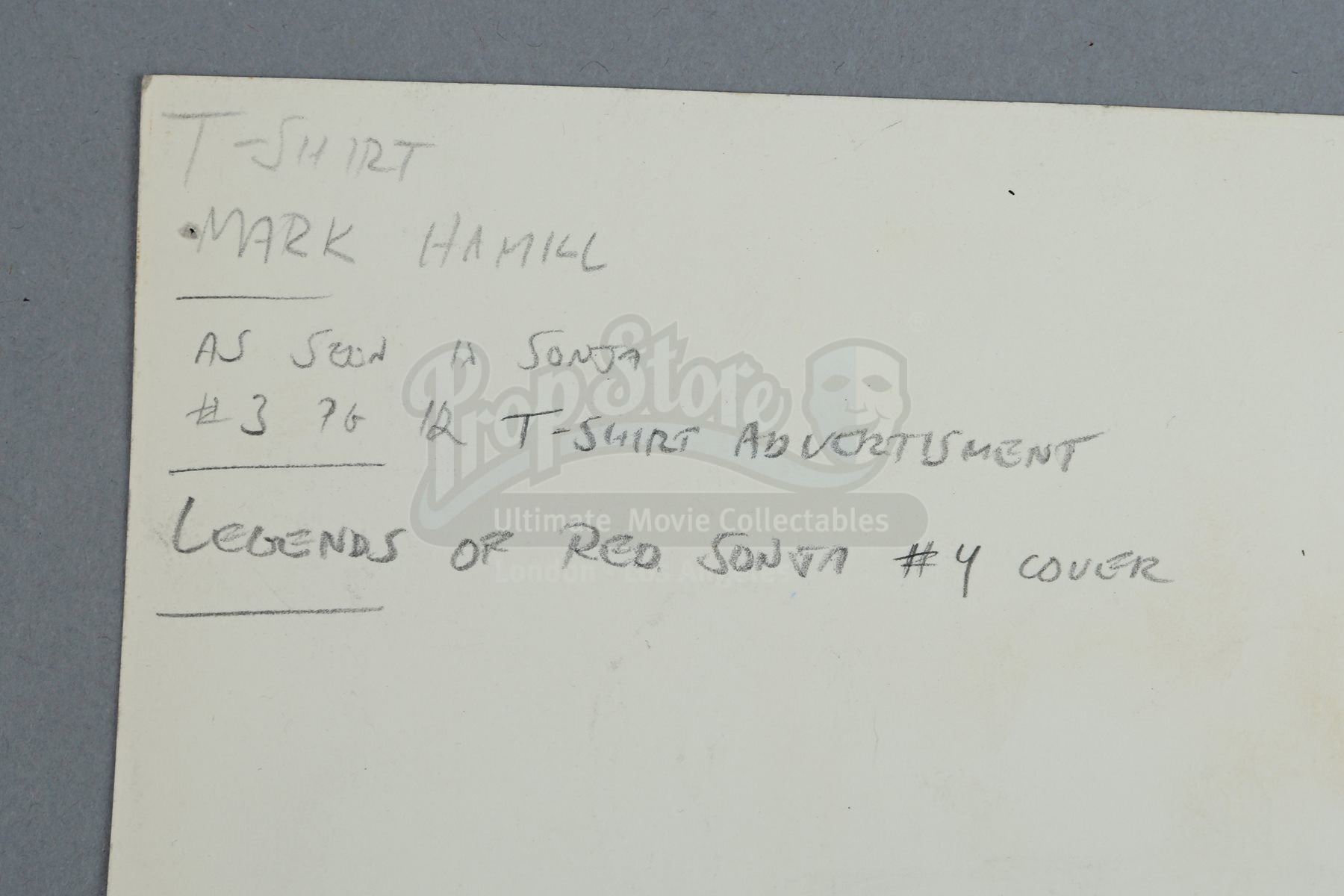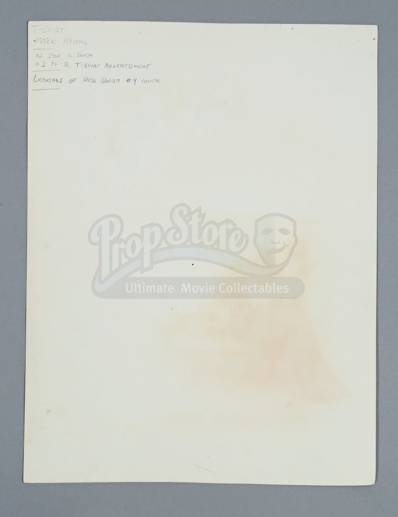 Paired with the T-shirt artwork is a Frank Thorne autographed copy of Legends of Red Sonja #4, featuring the referenced artwork used for the T-shirt design. Also included is a printed photograph of actor Mark Hamill wearing the Red Sonja T-shirt. Some white-out correction fluid is present around the pasted title art and copyright information. However, the artwork remains in very good condition. Dimensions (artwork): 38 cm x 28.5 (15” x 11 ¼”); (comic): 26 cm x 17 cm (10 ¼” x 6 ¾”); (photograph): 18 cm x 14 cm (7” x 5 ½”)