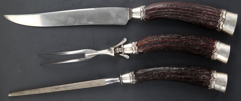 This consists of a carving knife, an accompanying meat fork and knife sharpener, fitted with grips of genuine red stag and the metal parts are in 800 fine silver. The end caps of each piece has the insignia depicting the national eagle emblem that rests upon a globe this reflected Ribbentrop’s office as Reich’s Foreign Minister. This lot has a reserve.