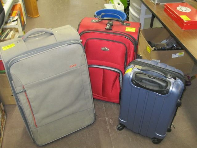 RED SUITCASE, GREY SUITCASE & BLUE ROLLING SUITCASE
