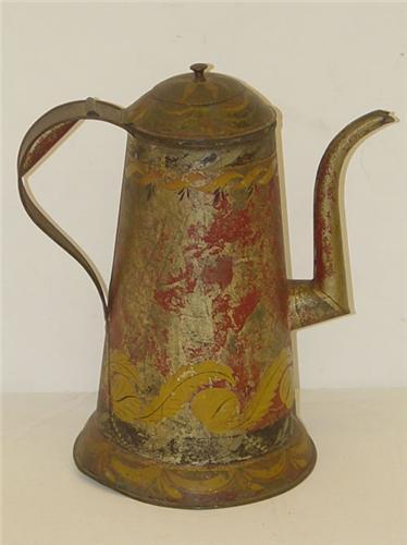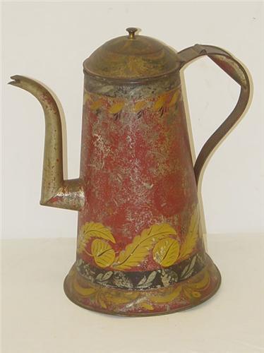 RED TOLEWARE LIGHTHOUSE COFFEE POT-19TH CENT. PA STYLE W/ GOOSENECK SPOUT & STRAP HANDLE W/ BLACK BANDS & YELLOW LEAFY & SWAG DECORATIONS (10 1/2" T X 6 1/4" W) - PAINT LOSS, DENTS & IMPERFECTIONS;