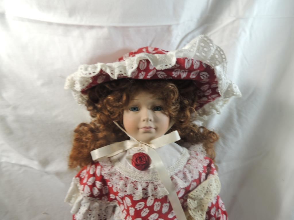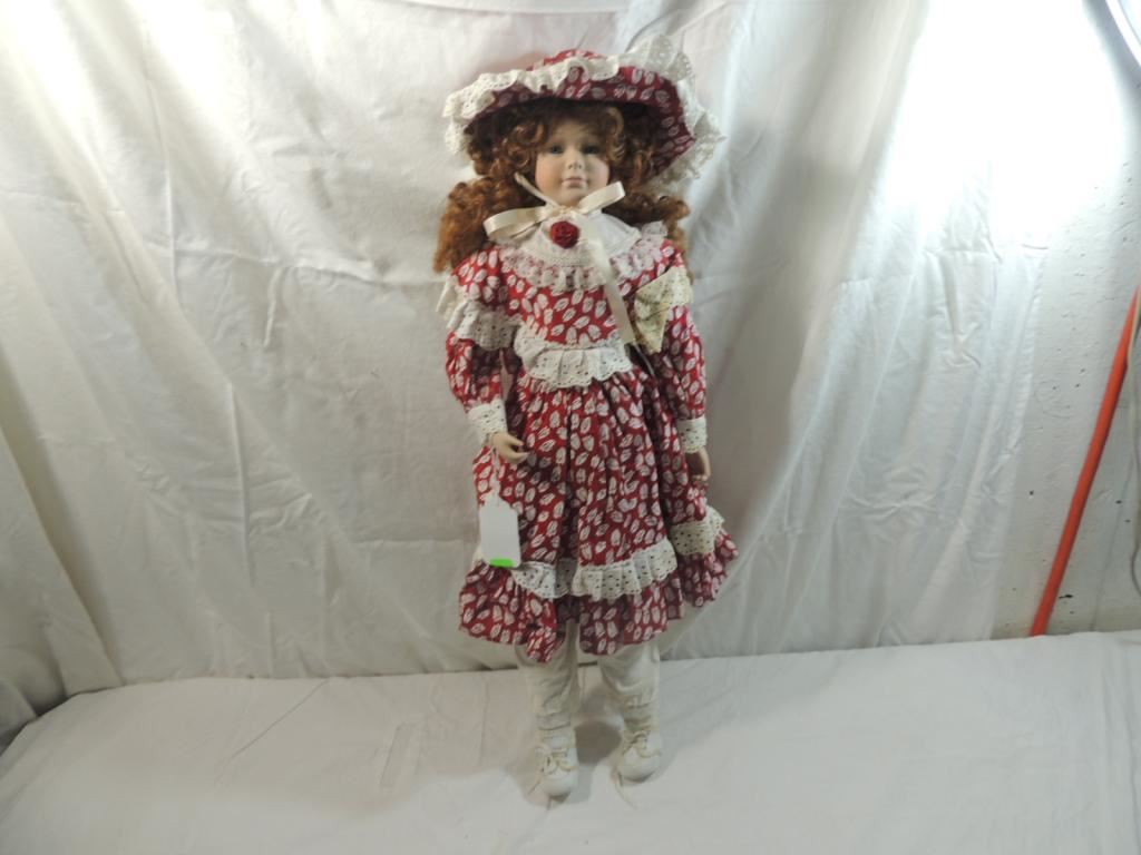 28" PORCELAIN DOLL DECORATIVE COLLECTORS DOLL, VINTAGE DOLL PRAIRIE DOLL, AS SHOWN SEE PHOTO FOR MORE DETAILS.