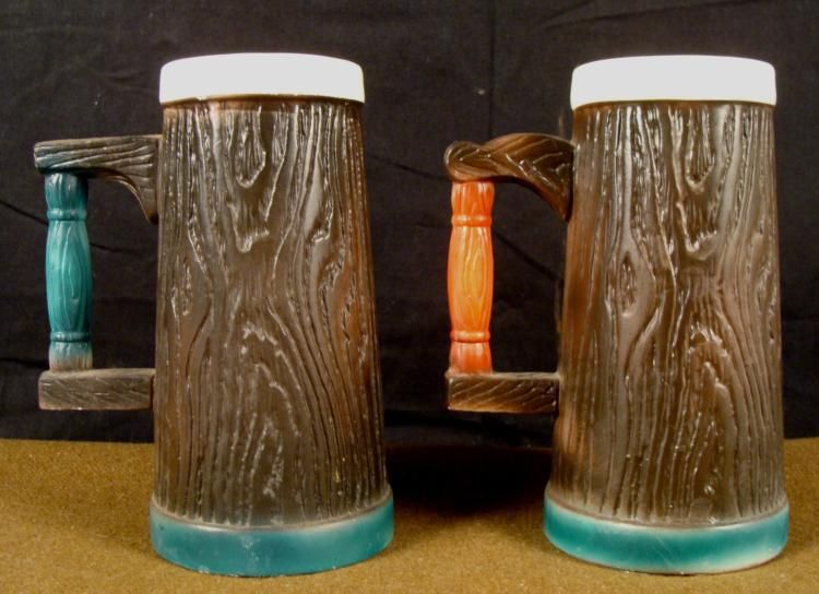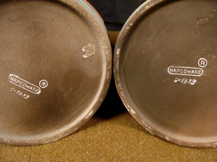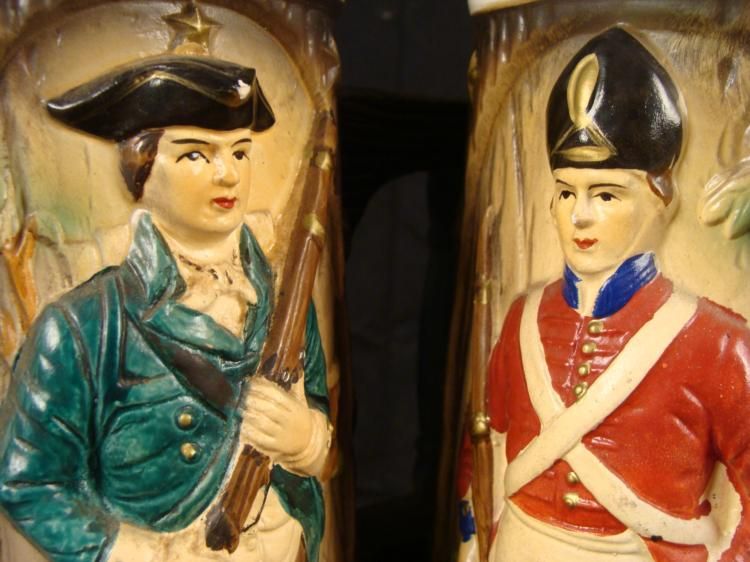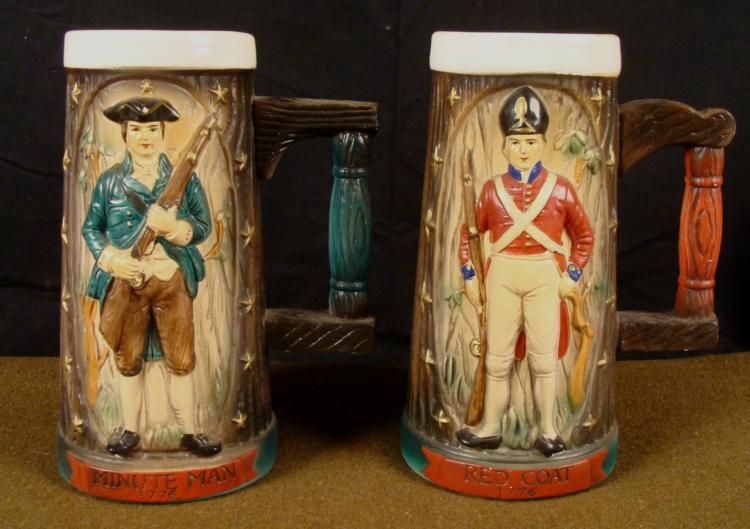 THIS IS A "REDCOAT" & "MINUTEMAN" 1776 MAT PAINTED CERAMIC MUGS. THEY ARE 8 1/2" TALL AND MARKED NAPCOWARE ON THE BOTTOM. THE BOTTOM DIAMETER FOR BOTH ARE 4 1/2". *
