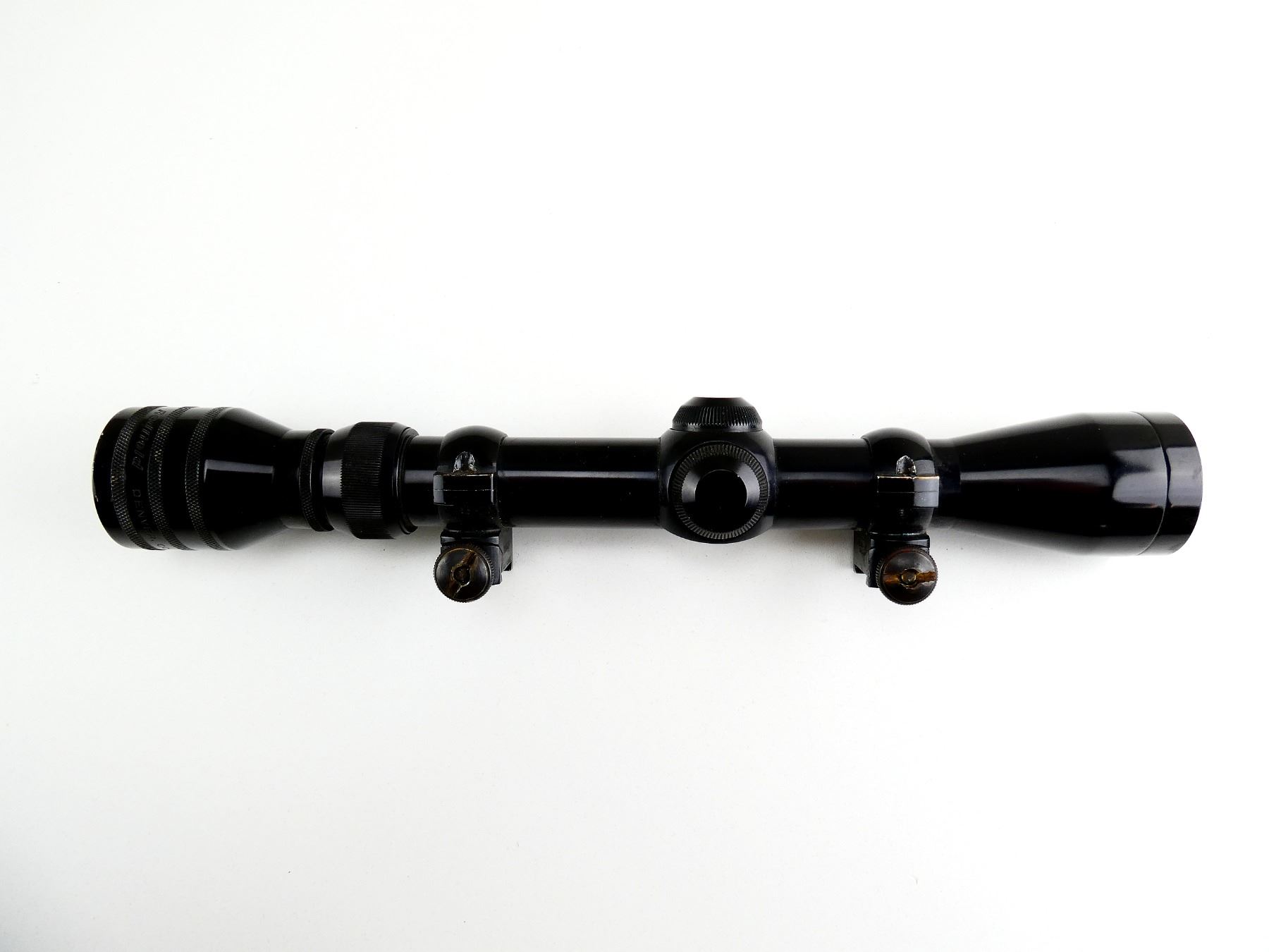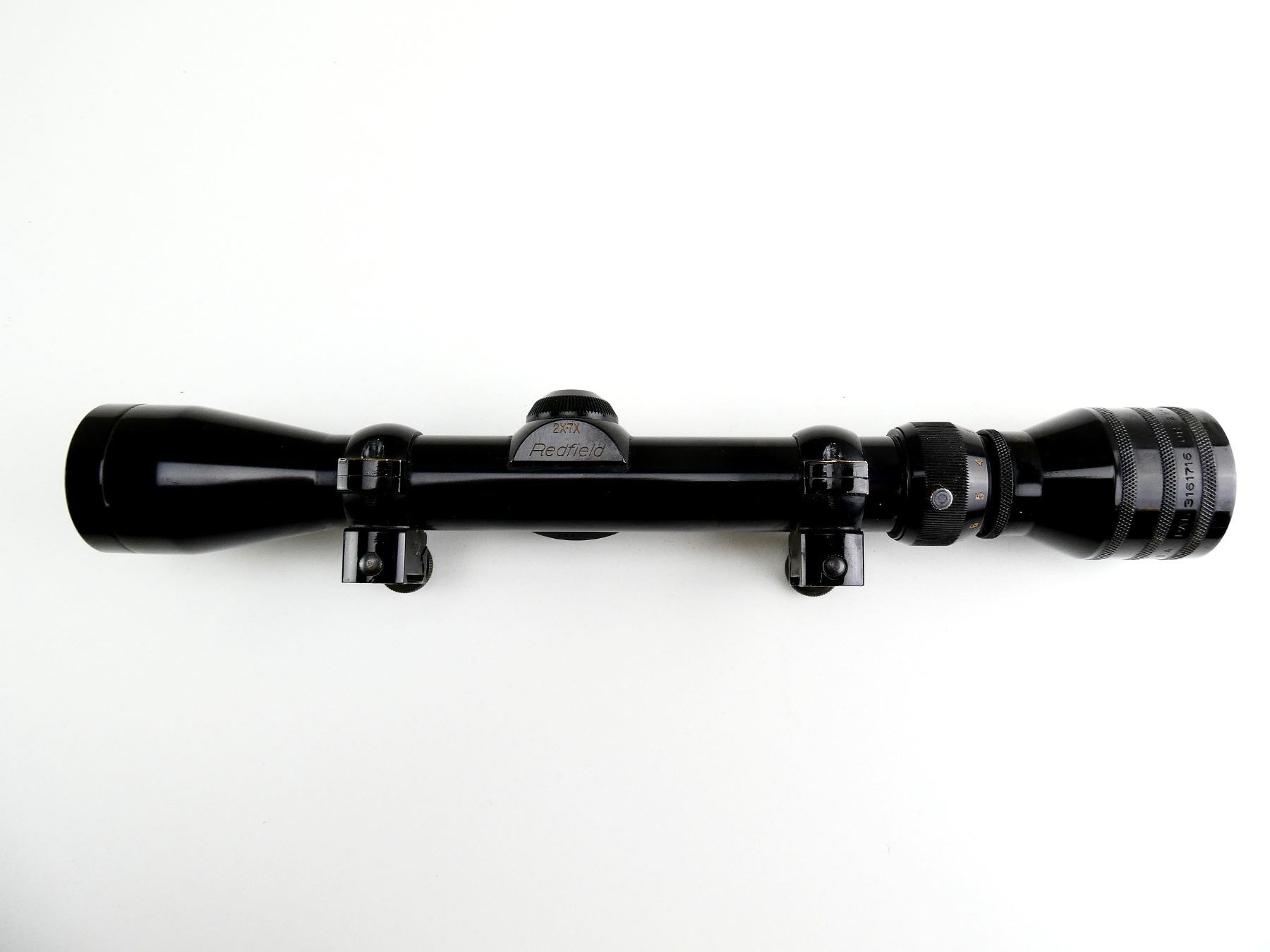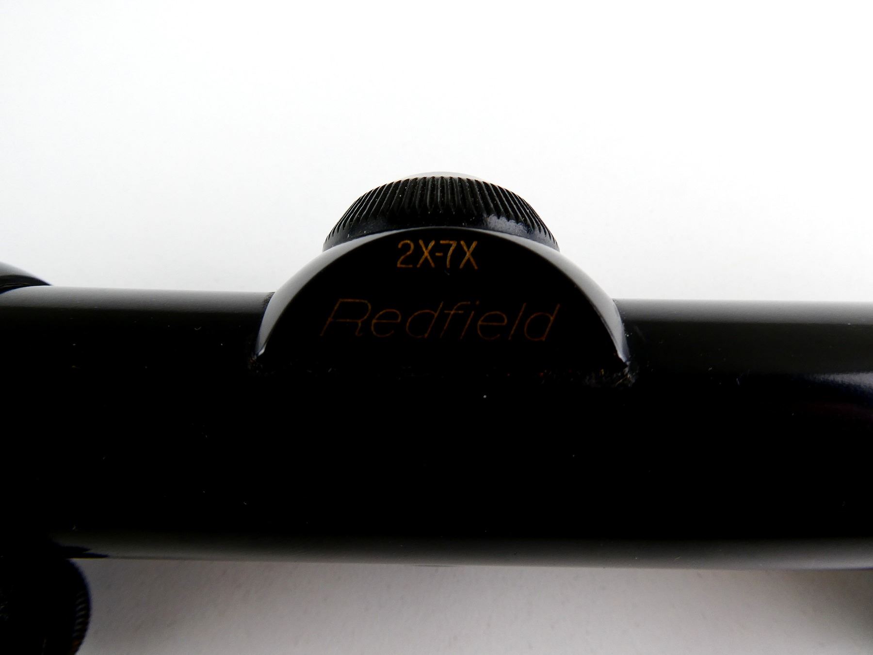 (1) CLEAR OPTICS, DUPLEX CROSSHAIR RETICLE, 1" TUBE DIAMETER, WORKING MAGNIFICATION RING, WINDAGE & ELEVATION KNOBS TURN, MARKED: "REDFIELD", "2X-7X", " 888301", ETC., WITH 1" SCOPE RINGS ATTACHED, SHOWS WEAR & TEAR / USE MARKS. SEE PHOTOS.