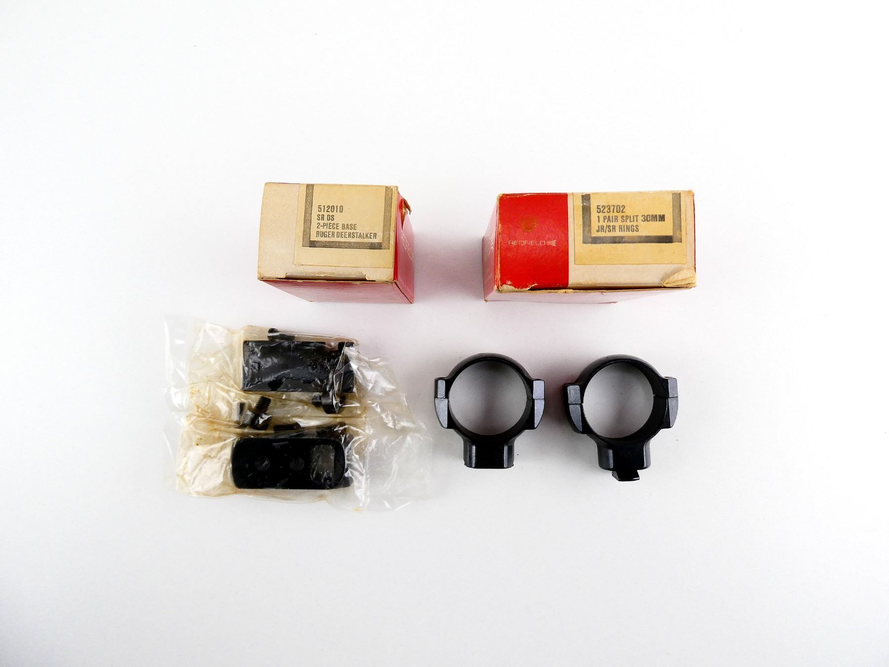 LOT INCLUDES; (1) SET OF 30MM SPLIT JR/SR SCOPE RINGS, BLACK MATTE STEEL, PART #: 523702, APPEARS NOS IN ORIGINAL PACKAGING, MAY NOT BE COMPLETE & (1) RUGER DEERSTALKER SCOPE MOUNT BASE, BLACK STEEL, PART #: 512010 SR DS, NOS IN ORIGINAL PACKAGING, MAY NOT BE COMPLETE. MAY REQUIRE FITTING. SEE PHOTOS.
