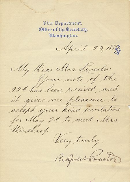 (1831 - 1908) 37th Governor of Vermont, Secretary of War from 1889 to 1891. Manuscript L.S. as Secretary of War on official letterhead, 1p. 8vo., Washington, Apr. 23, 1889 to First Lady Mary Todd Lincoln mentioning that he had received her letter and that it would give him great pleasure to mee "Mrs. Winthrop". Stray pen mark at top, else very good.