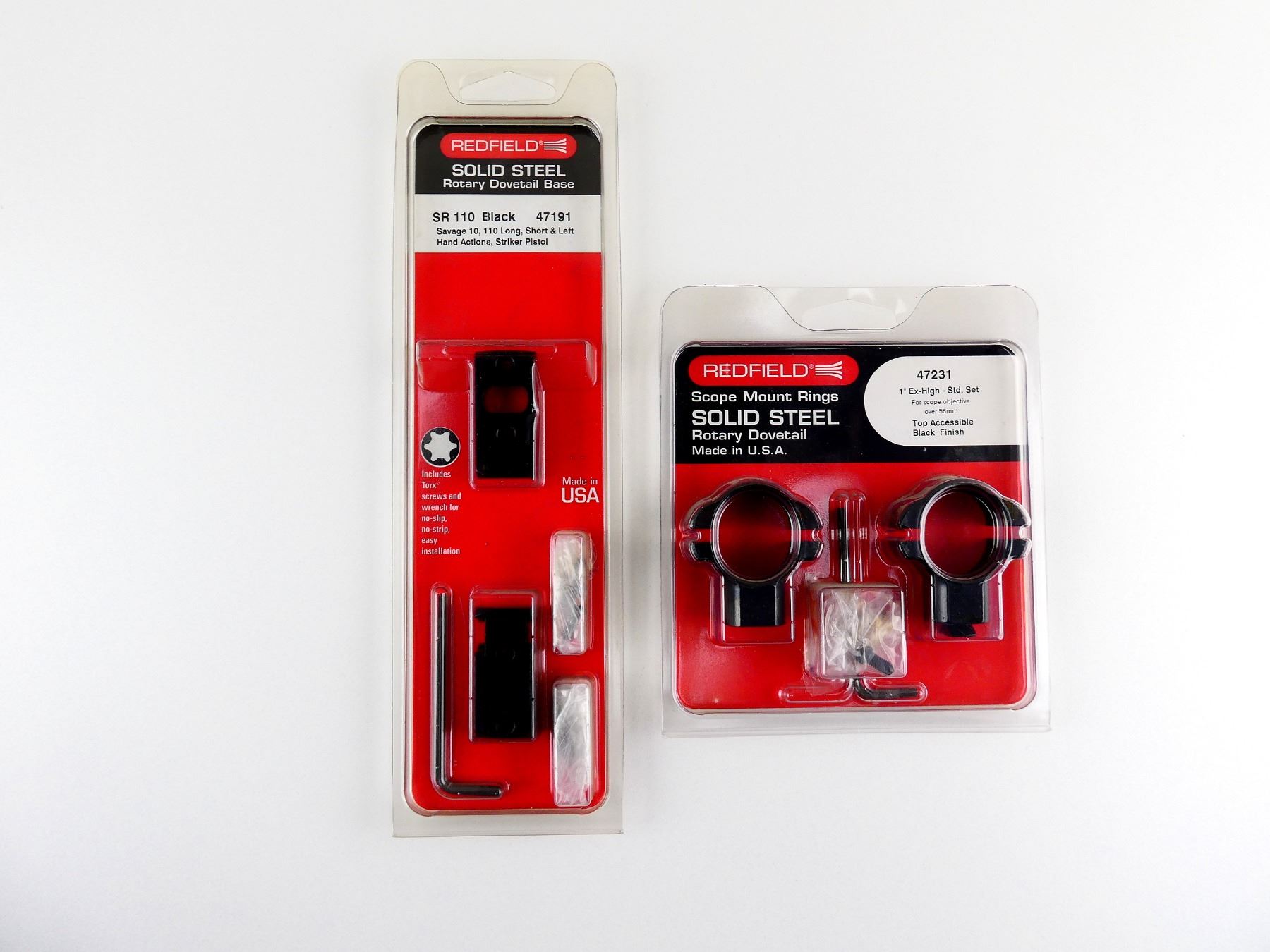 LOT INCLUDES; (1) PAIR OF 1" RINGS, BLACK STEEL, PART #: 47231, NOS IN ORIGINAL PACKAGING & (1) BASE SET, SR 110 FITS SAVAGE 10 / 110 LONG / ETC., BLACK STEEL, PART #: 47191, NOS IN ORIGINAL PACKAGING. MAY REQUIRE FITTING. SEE PHOTOS.