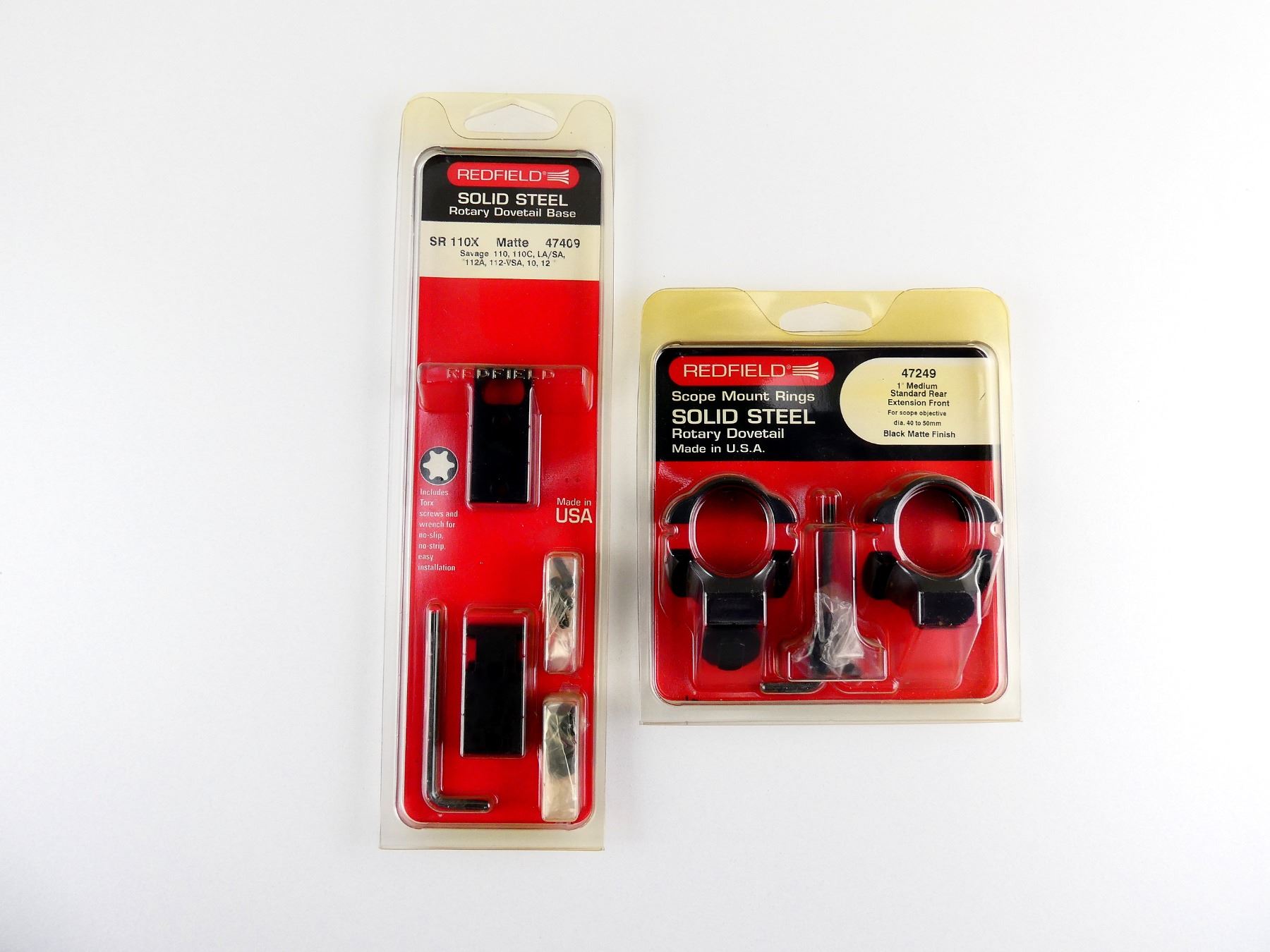 LOT INCLUDES; (1) PAIR OF 1" RINGS, BLACK STEEL, PART #: 47249, NOS IN ORIGINAL PACKAGING & (1) BASE SET, SR 110X FITS SAVAGE 10 / 110C / ETC., BLACK STEEL, PART #: 47409, NOS IN ORIGINAL PACKAGING. MAY REQUIRE FITTING. SEE PHOTOS.