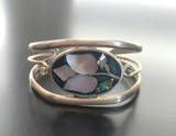 FLORAL INLAID SIGNED ALPACA MEXCO. 1" WIDE AT CENTER APPROXIMATE 2" DIAMETER BUT COULD BE BENT OPEN FOR LARGER WRIST